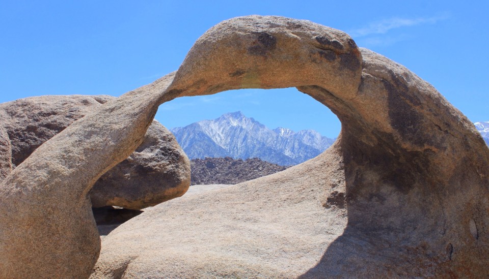 Der Mobius Arch ist nicht leicht zu finden, aber ein gutes Fotomotiv. Im Hintergrund sind einige Gipfel der Sierra Nevada zu sehen.
