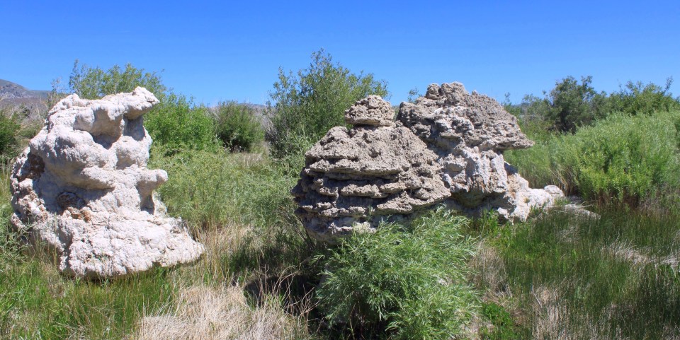 Einer der größten Kraterseen, der Mono Lake, wartet mit einer Besonderheit auf. Tuffstein-Skulpturen, die sich unterhalb der Wasseroberfläche an Zuläufen gebildet haben. Durch die, seit 1964, massive Wasserentnahme für Los Angeles aus den unterirdischen Zuflüssen ist der Wasserstand des Sees um 15 m gefallen. Die ehemals unterhalb des Wasserspiegels liegenden Gebilde stehen nun auf dem Trockenen.