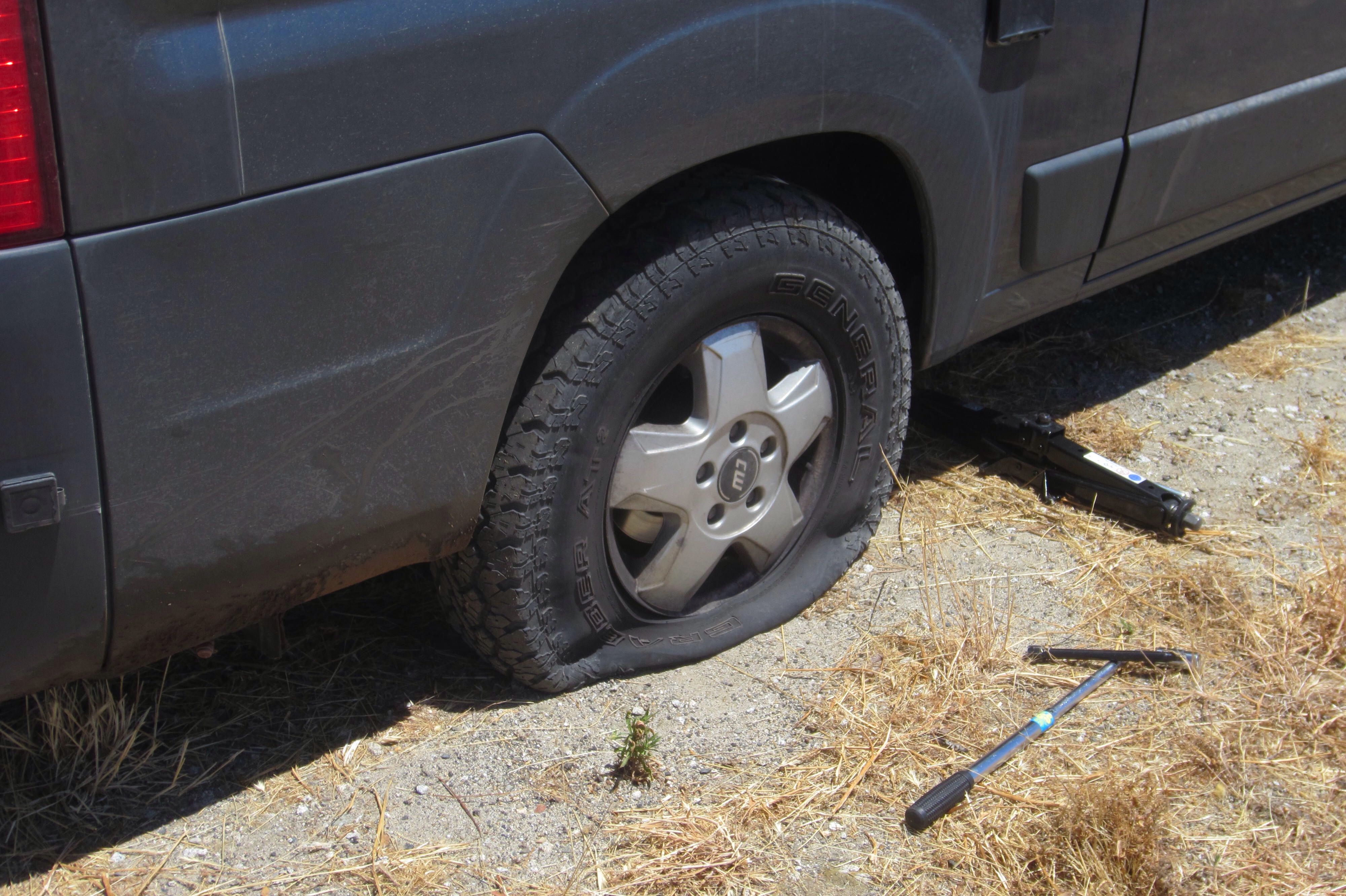 Eigentlich wollten wir in Fresno nur kurz einkaufen und tanken, aber dann kommt es anders als erwartet. So 30 km vor Fresno klappert plötzlich der rechte Hinterreifen heftig. Beim Stopp sehen wir, dass sich die Decke teilweise gelöst hat und der Reifen völlig kaputt ist.