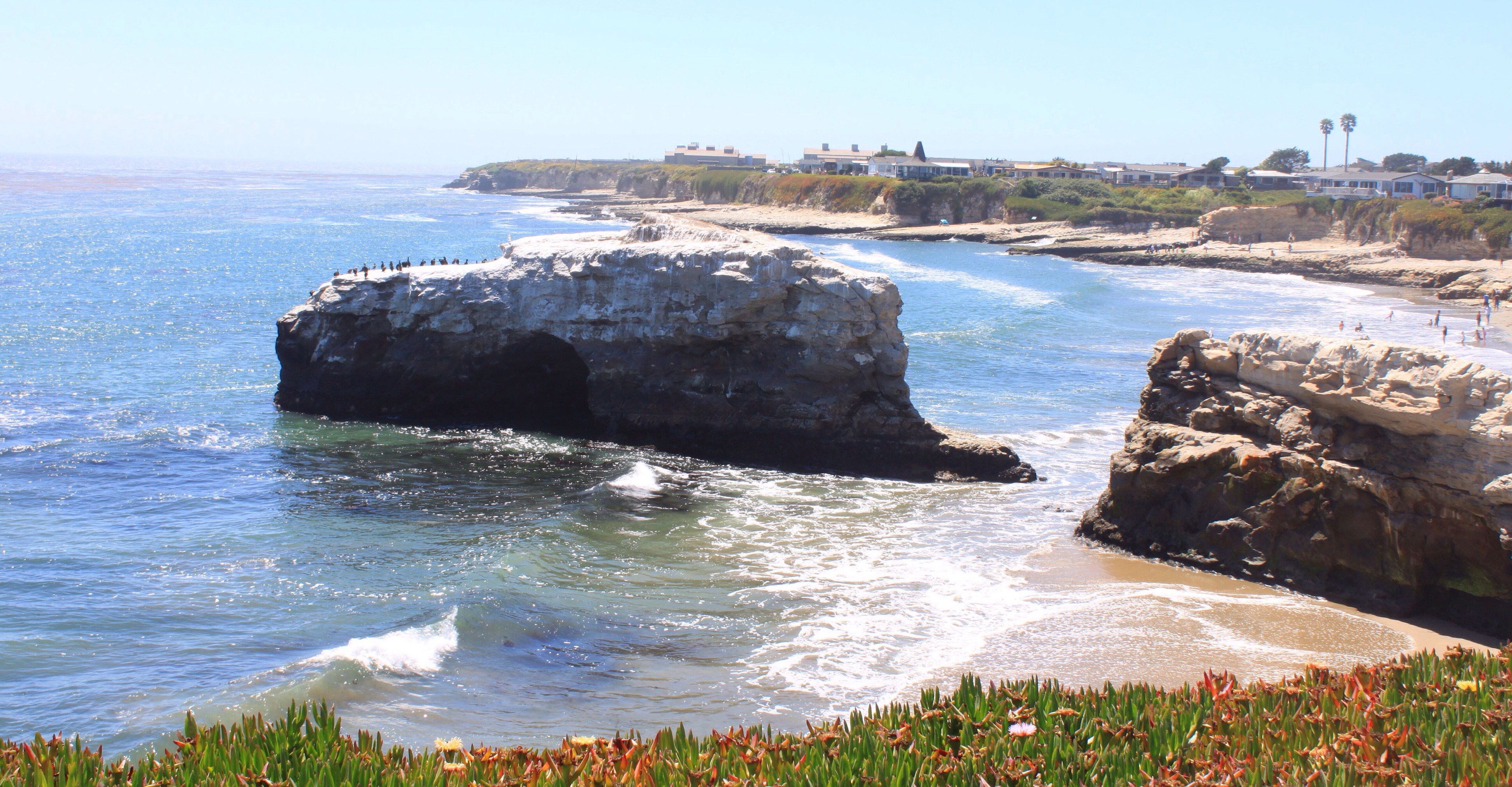 Die Sache mit dem Reifenhändler ging schnell, glücklicherweise war nur das Ventil undicht. Das war flugs getauscht und wir können unsere Reise fortsetzen. Zuerst fahren wir die Küstenstaße weiter bis Opal Cliffs, schauen da beim Mittagessen einigen Surfern zu (der Pazifik schickt heute nur kleine Wellen), und gucken uns dann noch die Natural Bridge in Santa Cruz an.