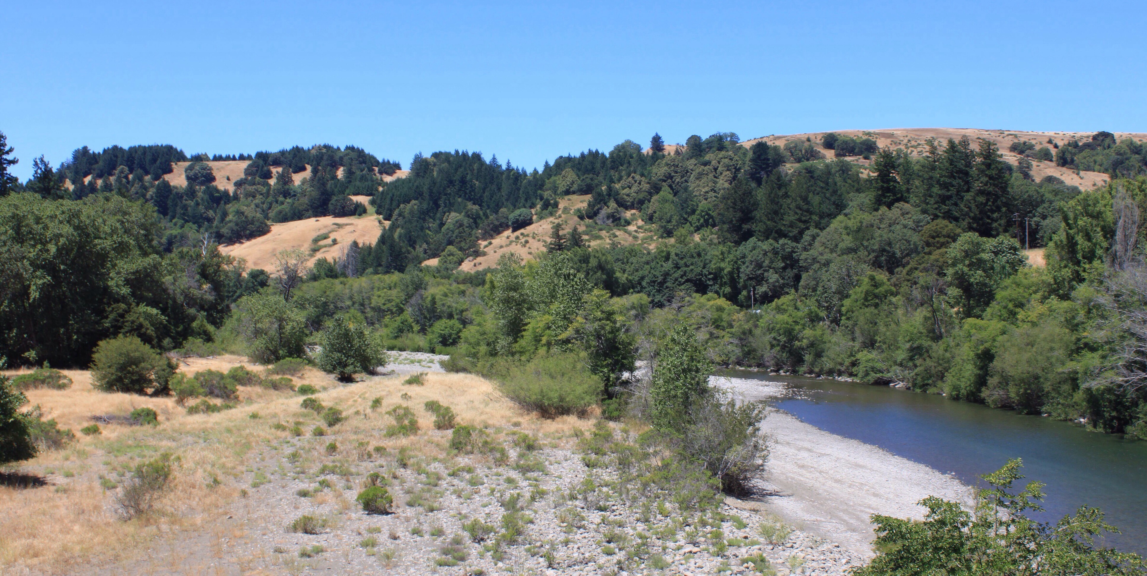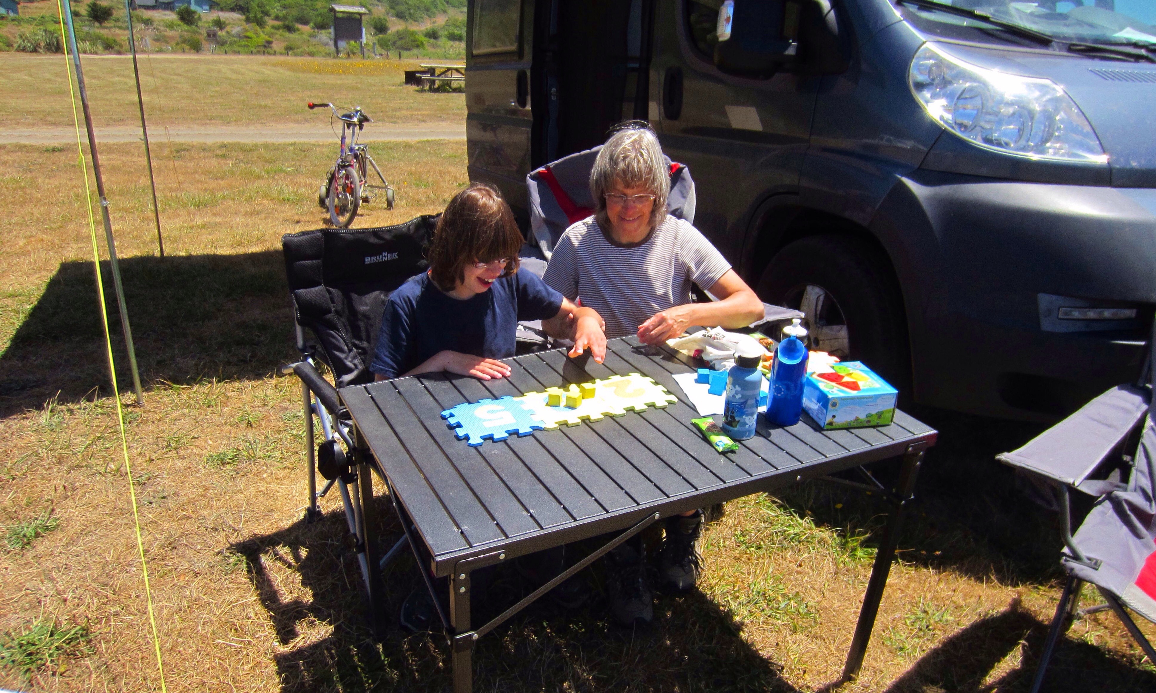 Fast ein bisschen wehmütig verlassen wir den Campground, nachdem wir von der Nachbarin noch ein paar Souvenirs (Stücke von Abalone Muscheln und „seaglass“) geschenkt bekommen haben, und fahren wieder über die Berge auf die US101. Im Humboldt Redwood State Park machen wir früh am Tage halt, Lina fährt noch ein wenig Rad und Clemens bereitet für den Abend vor.