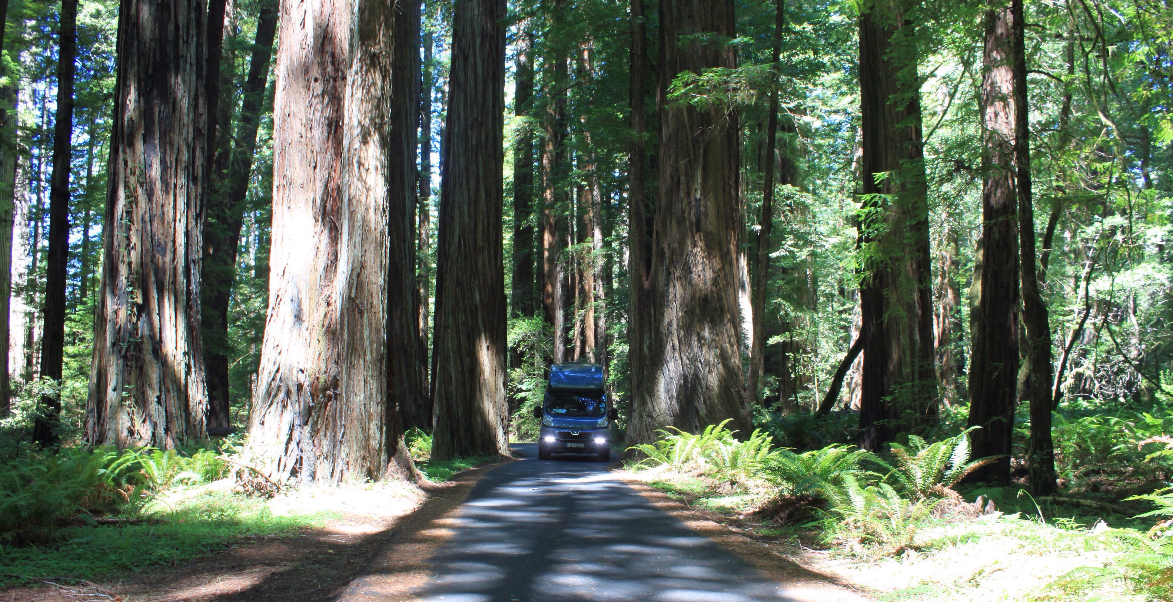 Die Zufahrt zum Campground führt um alte Redwoods herum.