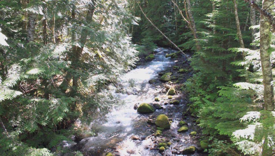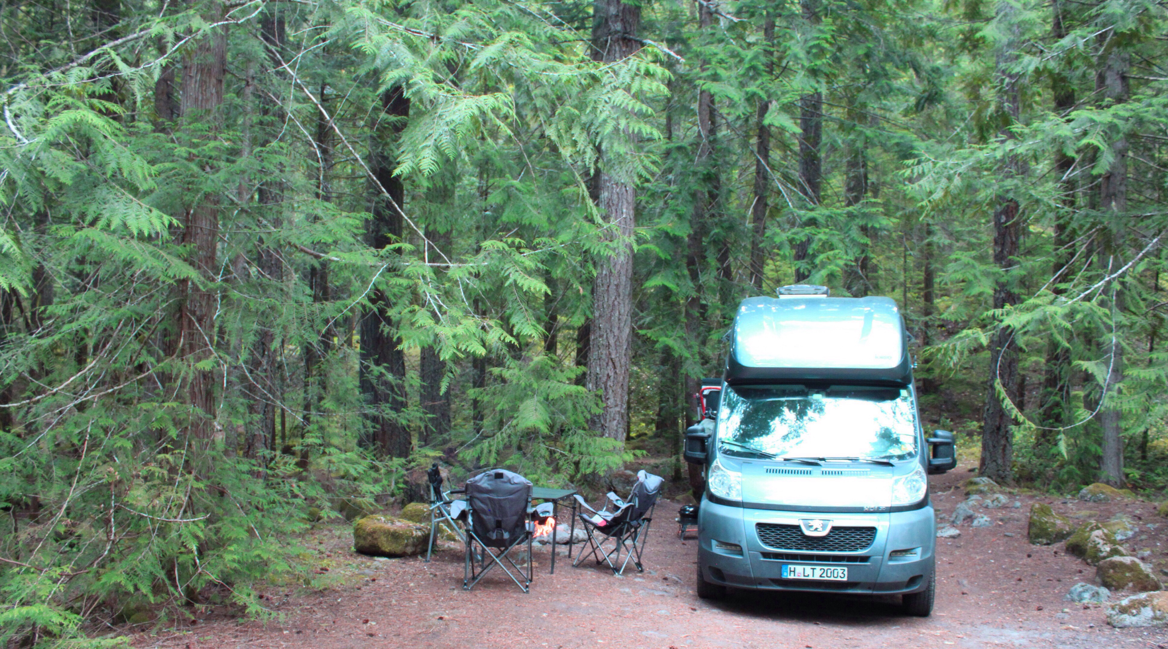 Wir mit unserem kleinen WoMo finden, durch iOverlander, in der Nähe von Mt. Hood wieder einen Traumplatz direkt am Fluss.