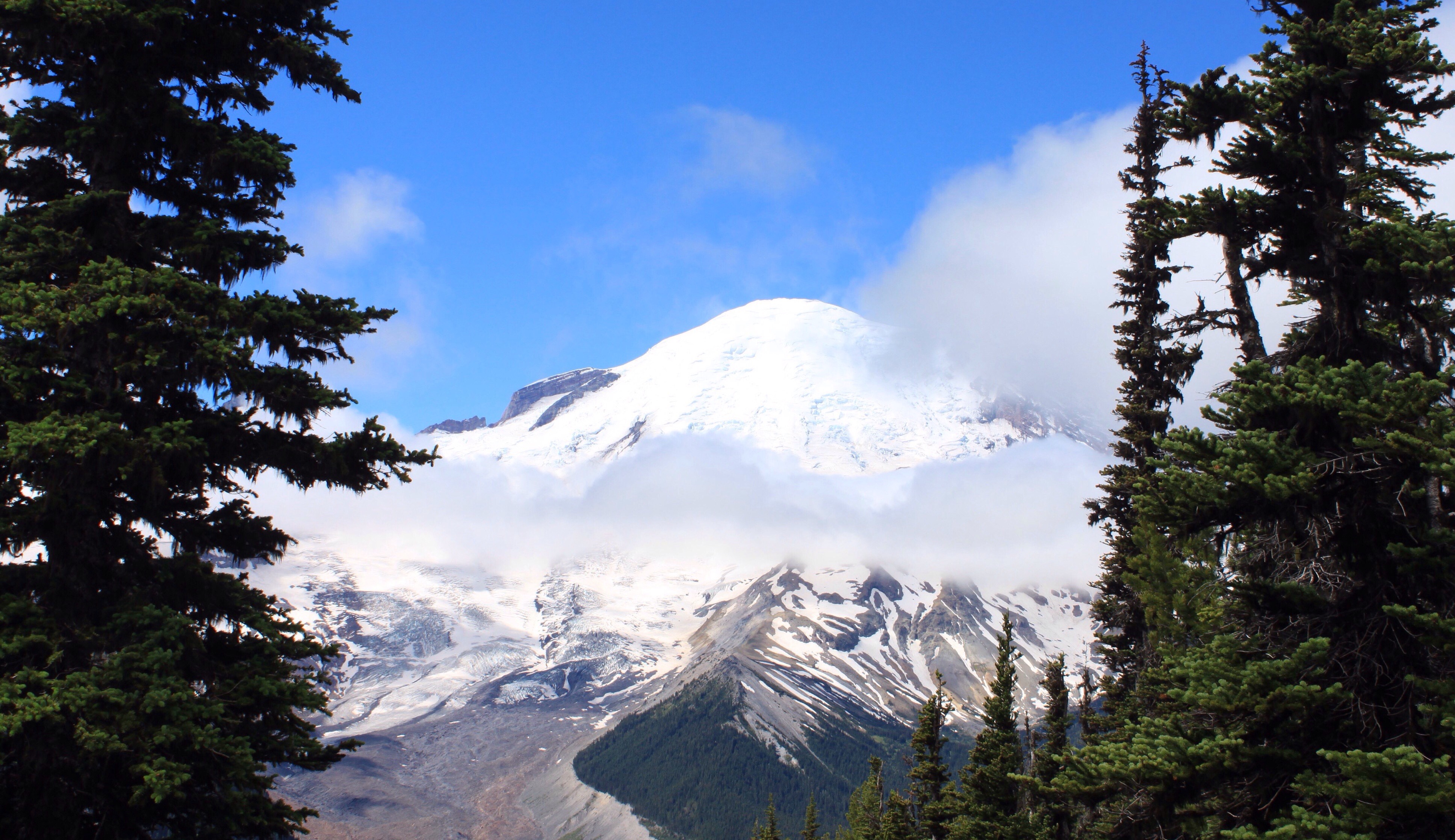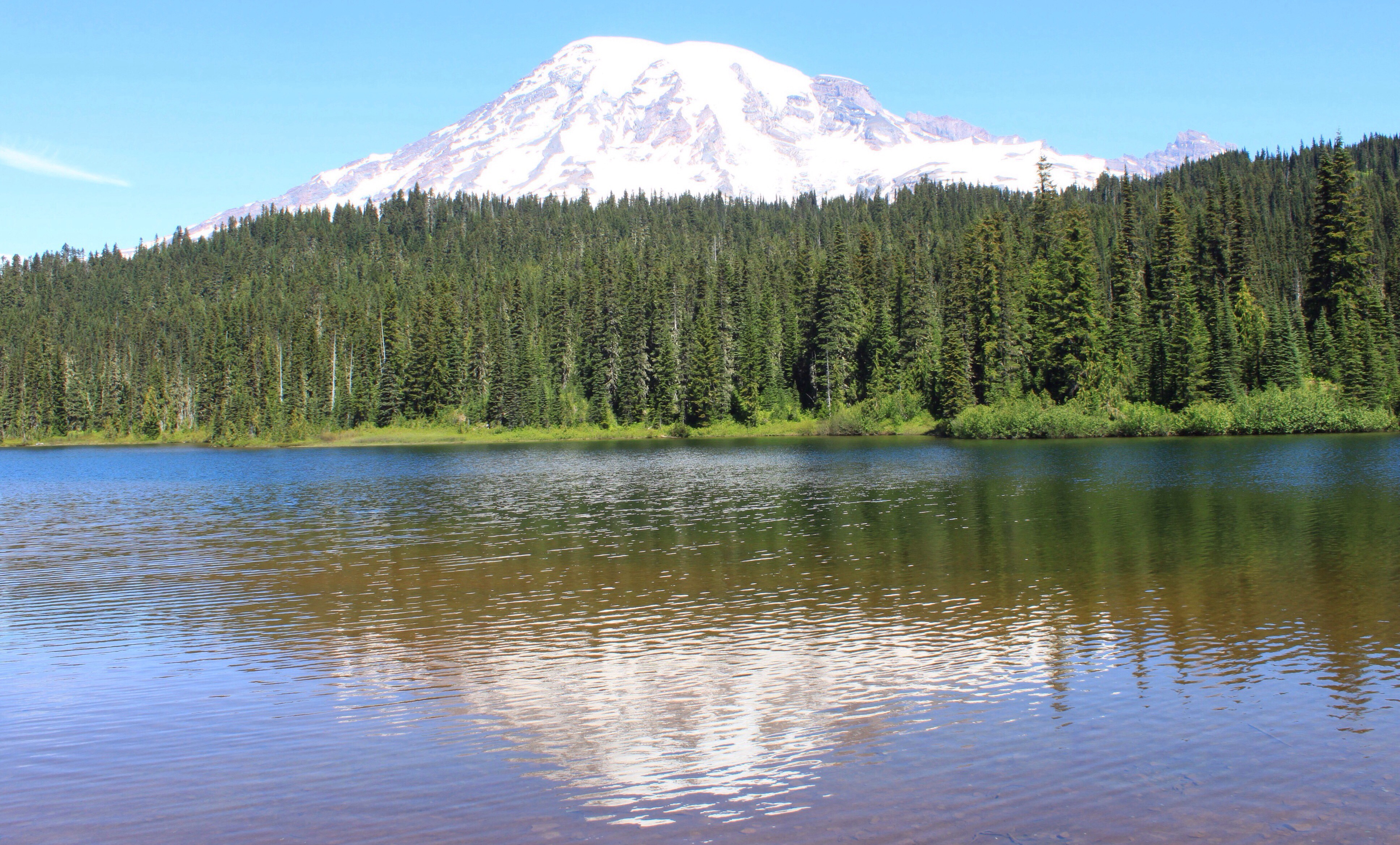 Mt. Rainier ist um einiges höher (die Dicke mit ihren gut 4200 m beherrscht das Panorama der Gegend) und in den letzten 100 Jahren auch friedlicher.