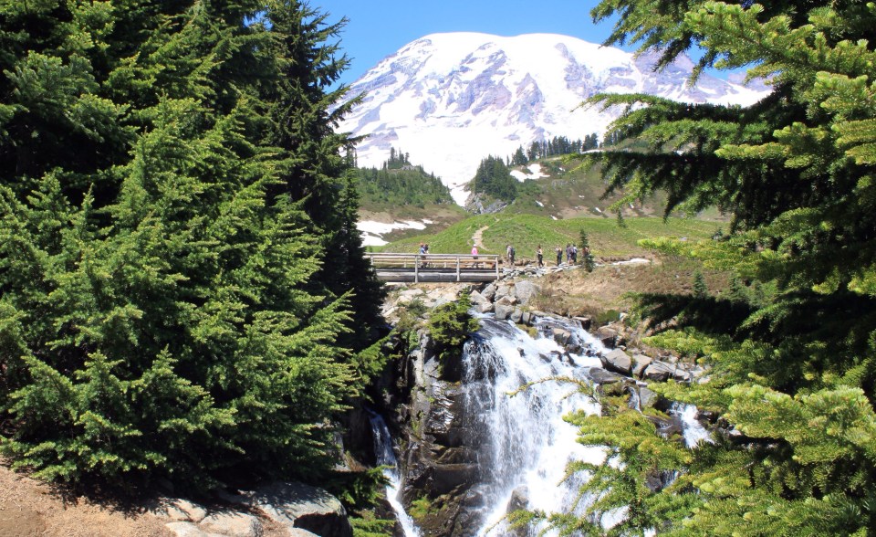 Der umgebende Nationalpark ist toll, aber leider sind die Trails teilweise noch verschneit. So können wir mit Lina nur einen kleinen Trail an den Paradise Meadows gehen. Den Wasserfall von der Brücke aus zu sehen, findet sie spannend.