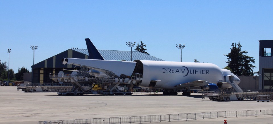 Die Rumpfteile und Tragflächen der 787 werden aus Kohlefaserverbund in Japan und Italien hergestellt und zur Endmontage in einer speziell umgebauten 747 eingeflogen.