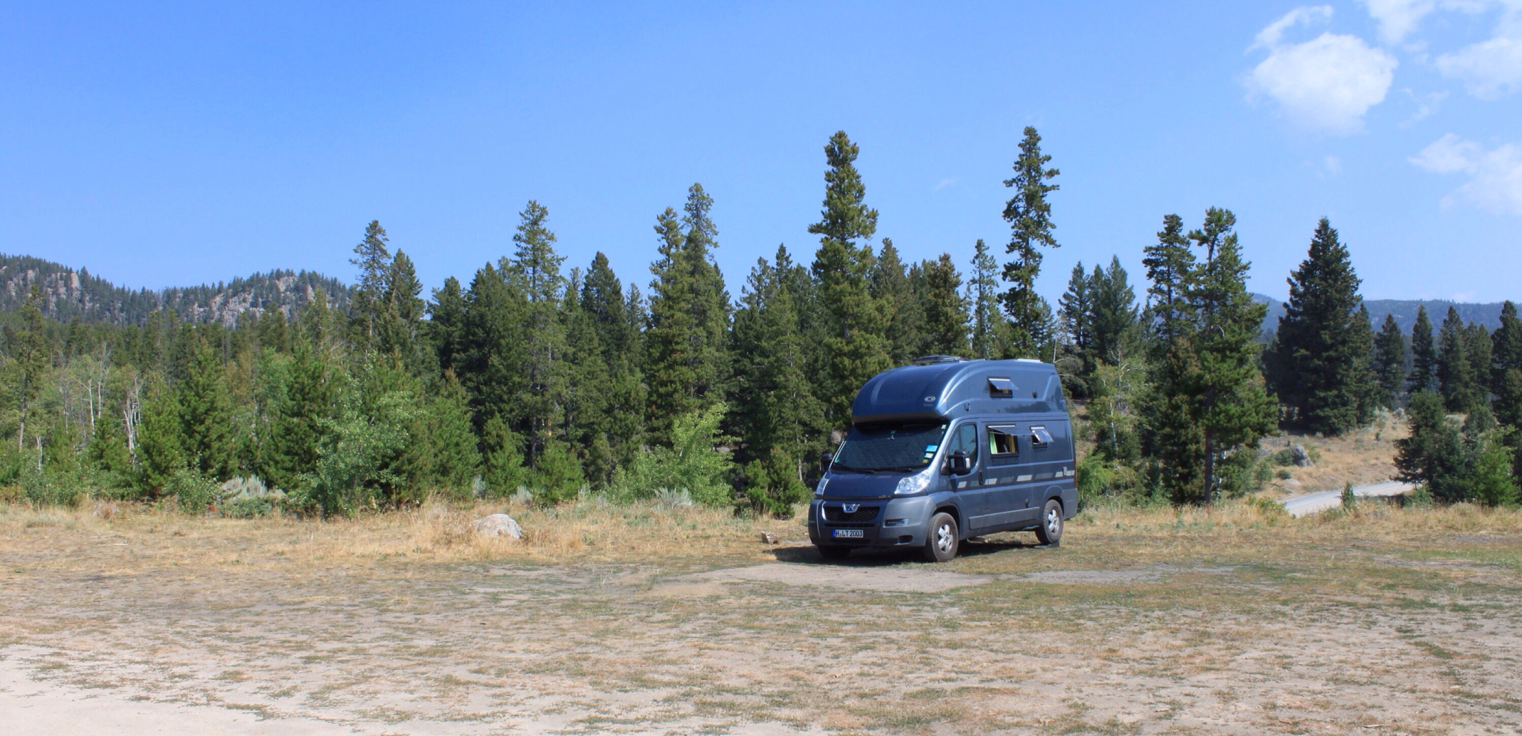 Als es zu dunkel wird, machen wir uns auf den Weg zum NF Campground außerhalb des Parks. Immerhin noch gut 70 km zu fahren. In der Dunkelheit auch kein Vergnügen. Nach 20 km halten wir nochmal am Fishing Bridge RV-Park, da steht zwar auch „full“, aber fragen kann man ja mal. Leider alles voll, aber auf dem Bridge Bay Campground, 5 km südlich, hat jemand abgesagt und den Platz können wir bekommen. Glück gehabt, so übernachten wir das zweite Mal im Yellowstone Park ohne eine Reservierung.😀 Direkt neben uns stehen Schweizer im eigenen Pössl. Da es mittlerweile nach 10 Uhr ist, fällt der Klönschnack eher kurz aus.