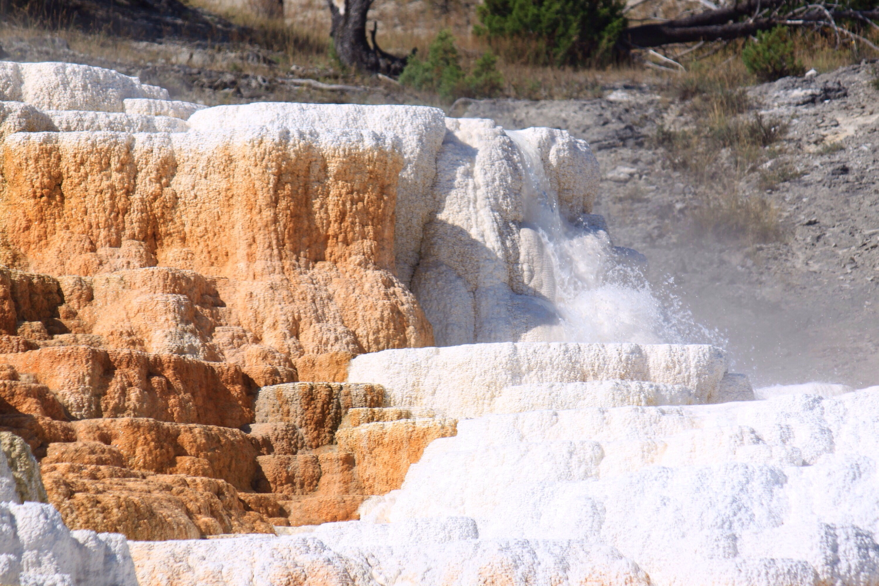 Morgens das kurze Stück wieder in den Park und gleich eine Site im Mammoth CG gemietet. So können wir heute in Ruhe die „Nordschleife“ drehen und haben, ganz im Gegensatz unserer Gewohnheit, einen Übernachtungsplatz bereits am Vormittag gebucht. Erster Stopp bei der Mammoth Terraces Area. Hier strömt heißes Wasser an die Oberfläche und lagert dann gelöstes Kalziumkarbonat terrassenförmig ab.
