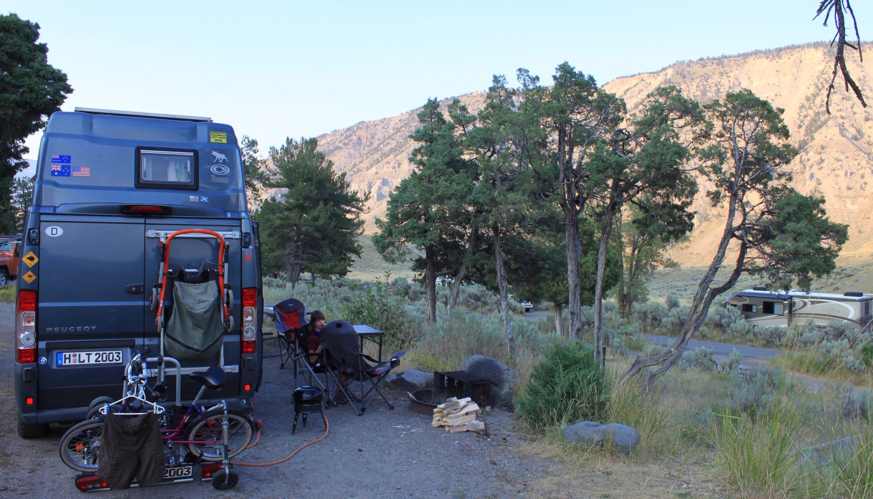 kommt der Yellowstone NP. Wir fahren spätnachmittags erstmal rein und fragen im Mammoth Campground einfach mal an. Aber diesmal ist wirklich alles voll. Da es schon spät ist, nutzen wir den ersten NF-Campground bei Gardiner außerhalb des Parks zur Übernachtung. Auch hier ist nur noch die Group-Site frei. Wir teilen wieder mal.