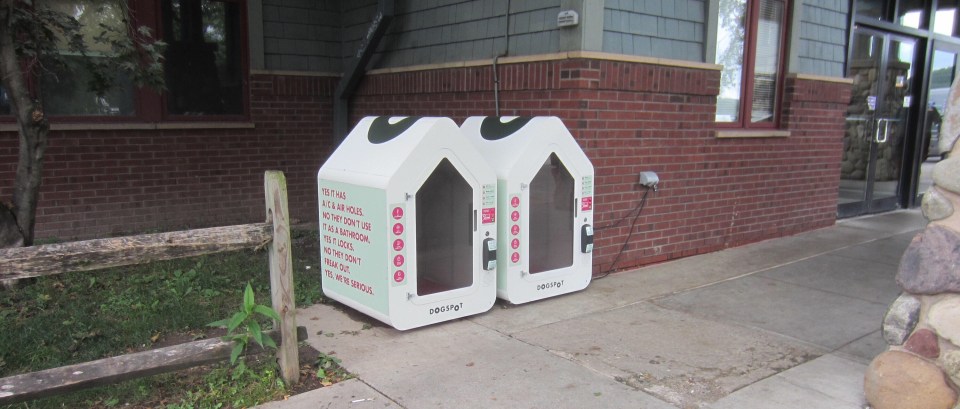 Hier gibt es viele Hunde, in den Supermärkten Regale voll Hundefutter und Zubehör aber oftmals sind Hunde in öffentlichen Gebäuden, Parks oder auch Restaurants verboten. An dieser Raststätte gibt es extra klimatisierte Hundeboxen.