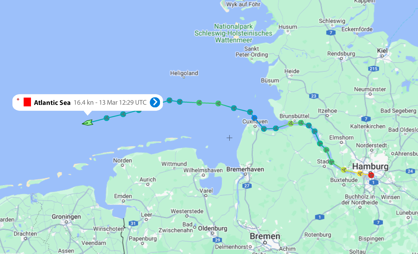 Die Atlantic Sea verlässt Hamburg und Rocky ist (hoffentlich) an Bord.
