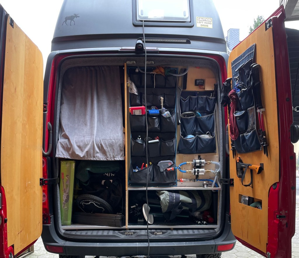 Nun sind erstmal die letzten Wartungen und Reparaturen (neue Bremsen) an Rocky fällig. Dann noch die Trennwand zwischen Fahrerkabine und Wohnraum einbauen, alle Klamotten verstauen und auch das Fahrrad für Lina soll diesmal mit. Ist zwar eng in den Staufächern, aber es passt irgendwie alles rein.