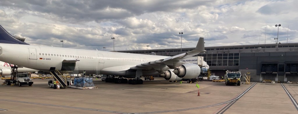 Kaum im Flugzeug angekommen starten wir zum ersten kurzen Flug nach Frankfurt. Dort gelandet müssen wir uns beeilen, da es hier mit dem Rolliservice nicht recht klappt und wir uns schließlich selbst den Leihrolli nehmen um schnellstmöglich zum Abflugbereich der internationalen Flüge zu kommen – gerade noch rechtzeitig! Pass- und Boardingkartenkontrolle und schon sitzen wir in unserem Flieger nach Washington. Das ging jetzt sehr schnell. 😅