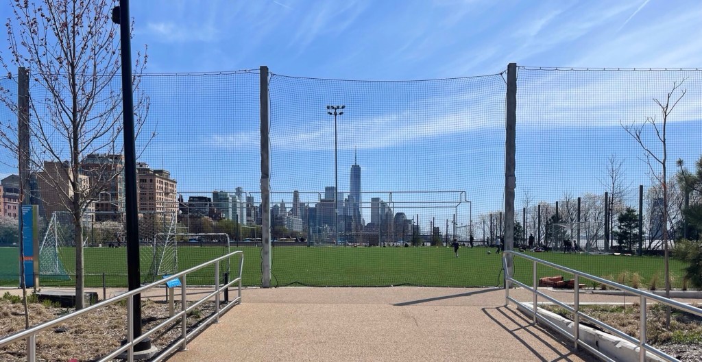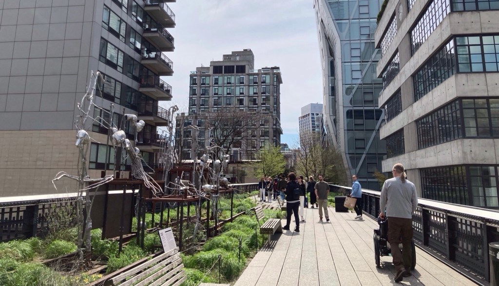 Vorbei an Miss Liberty (haben wir auftragsgemäß von Martina gegrüßt) steigen wir in Midtown aus und erklimmen die High Line, eine alte (Hoch-)Bahnlinie die zu einem Park umgebaut wurde. Vorher gibt’s noch lecker Sandwich mit Hühnchen in einem kleinen Laden an der Straße. Die Verkäuferin fragt gleich wo wir herkommen und es stellt sich heraus, dass sie für einige Jahre in Süddeutschland gelebt hat. Dafür staubt Lina gleich noch ein großes Stück Schokoladenkuchen ab. 😋 Nun aber hoch auf die High Line und wir wandern ganz entspannt viele Häuserblocks nach Süden gen Down Town.