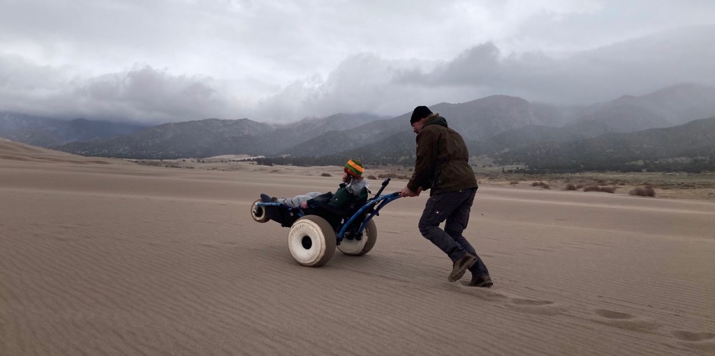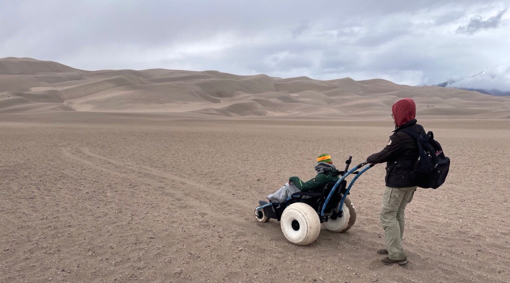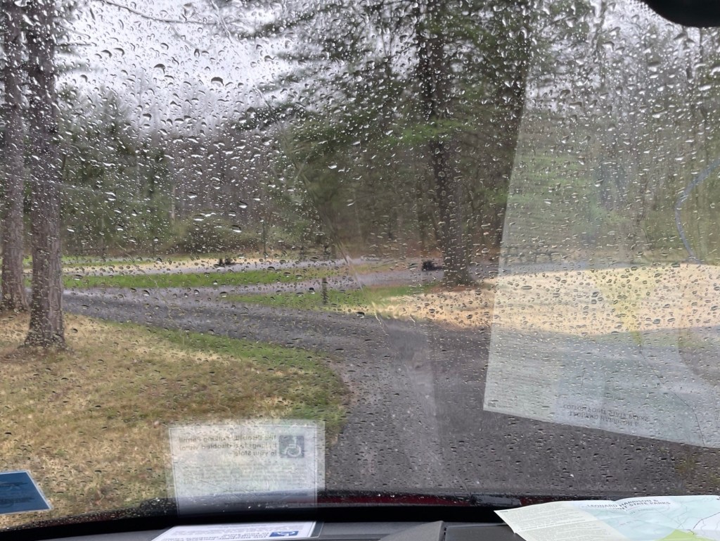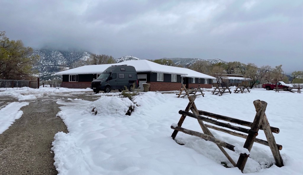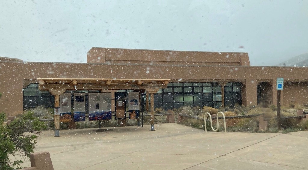 Das Wetter ist heute, zurückhaltend ausgedrückt, bescheiden. Von den Bergen sehen wir nichts und auch die Straße verschwindet manchmal im Nebel, oder soll ich sagen in den Wolken? Ab und an fällt Regen und wir besuchen erstmal das Visitor Center um ein paar Informationen zu bekommen. Die haben wie in allen anderen NP’s auch eine gute Karte vom Park. Wir fragen nach, ob der 4×4 Trail fahrbar ist? Der nette Ranger erzählt uns, dass dieses Frühjahr bisher nur ein Teil der Strecke geöffnet ist und rät und davon ab, diesen Teil bei der Witterung zu fahren. Die Flussdurchfahrt am Beginn ist sandig und weich, 4 Tonnen wären da viel zu viel. So erkunden wir die Dünen zu Fuß und bekommen einen Schlüssel mit dem wir uns einen speziellen Rolli ausleihen können. Kaum wieder vor der Tür fängt es richtig an zu schneien.