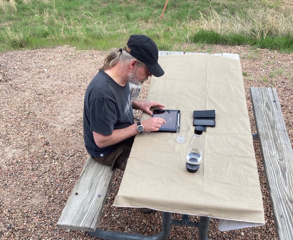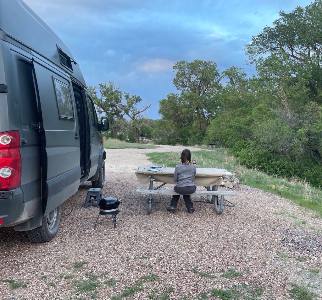 Clemens nutzt die Picknickbank zum Schreiben und dann gibt’s gegrilltes. 😋 Morgen wollen wir Dodge City einen Besuch abstatten.