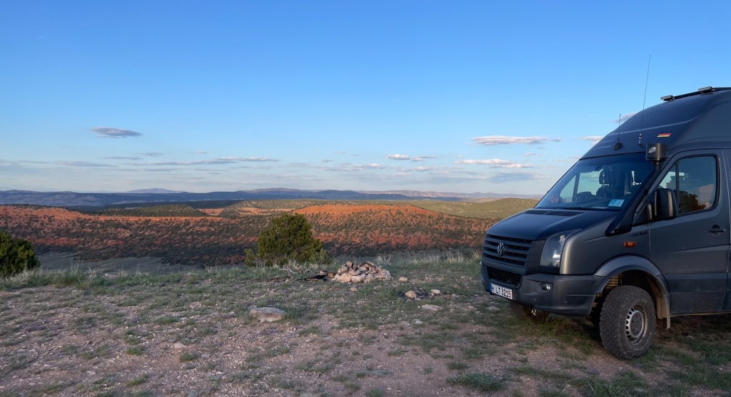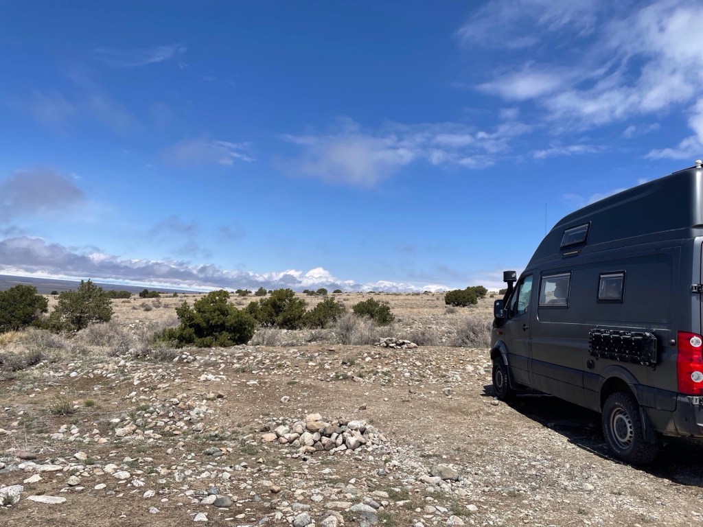 Unseren ersten Übernachtungsplatz in den Rockys finden wir ganz in der Nähe des Great Sand Dunes Nationalparks auf „Public Land“. Hier dürfen wir maximal 14 Tage am Stück kostenlos campen. Die Anfahrt ist steil und teilweise ausgewaschen, der Platz etwas schräg, aber die Aussicht ist grandios.