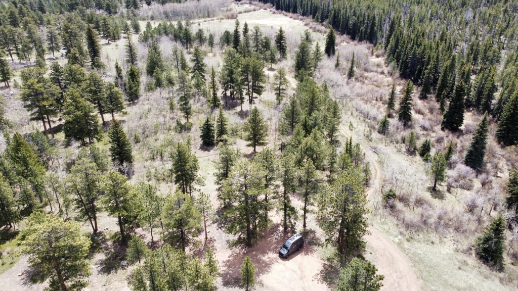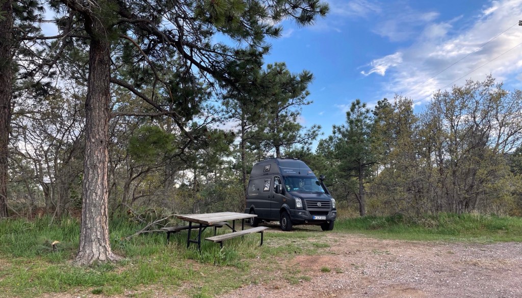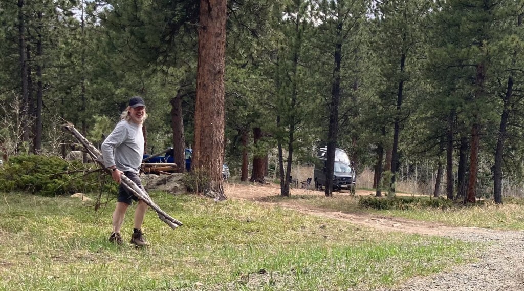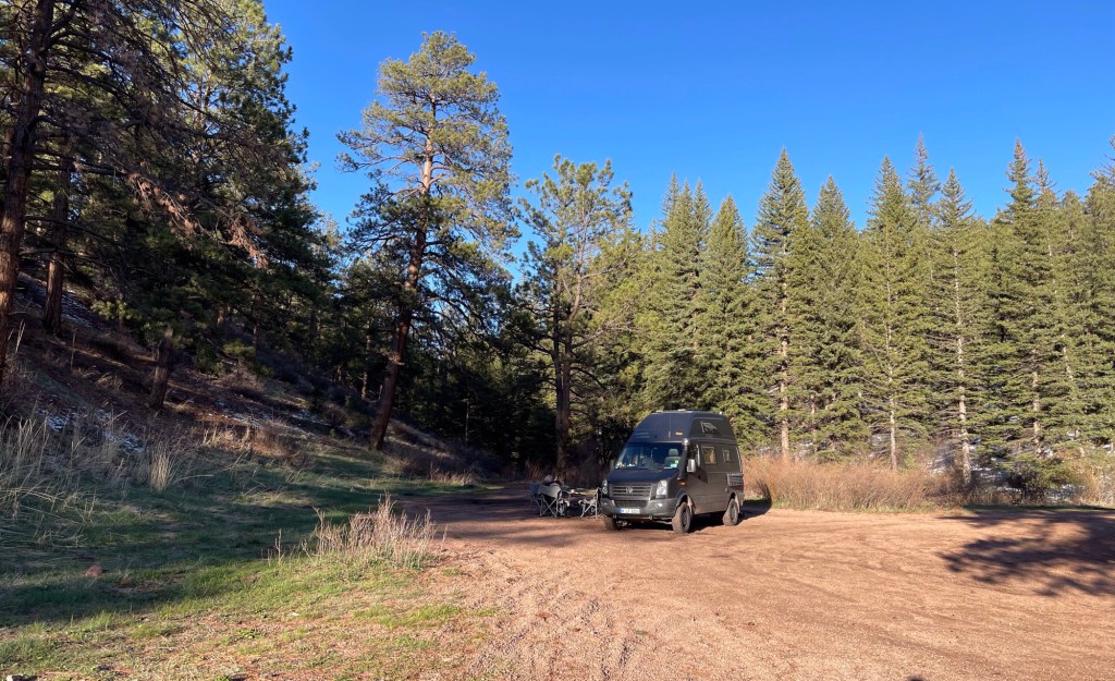 Nun dann fahren wir eben wieder raus aus dem Park und suchen uns, nördlich auf „National Forest“ Land in der Comanche Peak Wilderness, einen Übernachtungsplatz. Nach gefühlten 40 km Schotterpiste findet sich tatsächlich ein toller Platz. Absolut einsam (so denken wir), kein Mobilnetz und genug Feuerholz in der Nähe, -was braucht es mehr?-