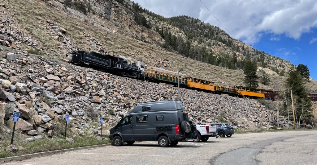 Da wir morgen nach Georgetown wollen, da gibt es einen alten Westernzug durch die Rockys, fragen wir gleich mal nach, ob wir auch zwei Nächte bleiben können. Ist natürlich gar kein Problem, und da wir dann morgen Abend wieder kommen, sind wir auch gleich auf Jim‘s Veranda ans Lagerfeuer eingeladen. Die Einladung nehmen wir natürlich gern an. Nun aber erstmal was warmes essen und dann schnell ins Bett, morgen wird es anstrengend.