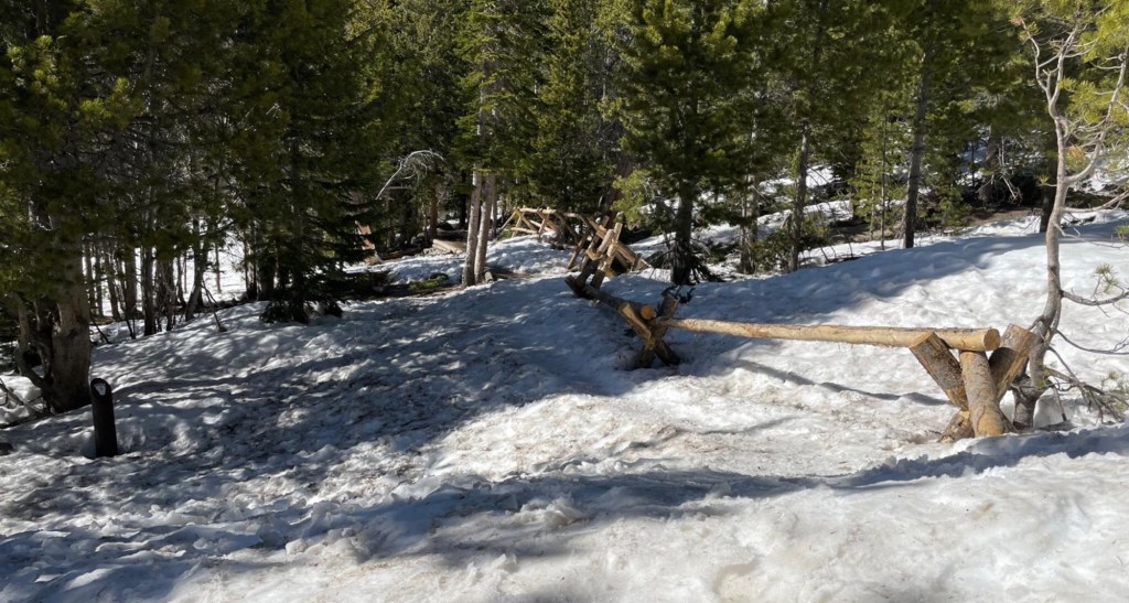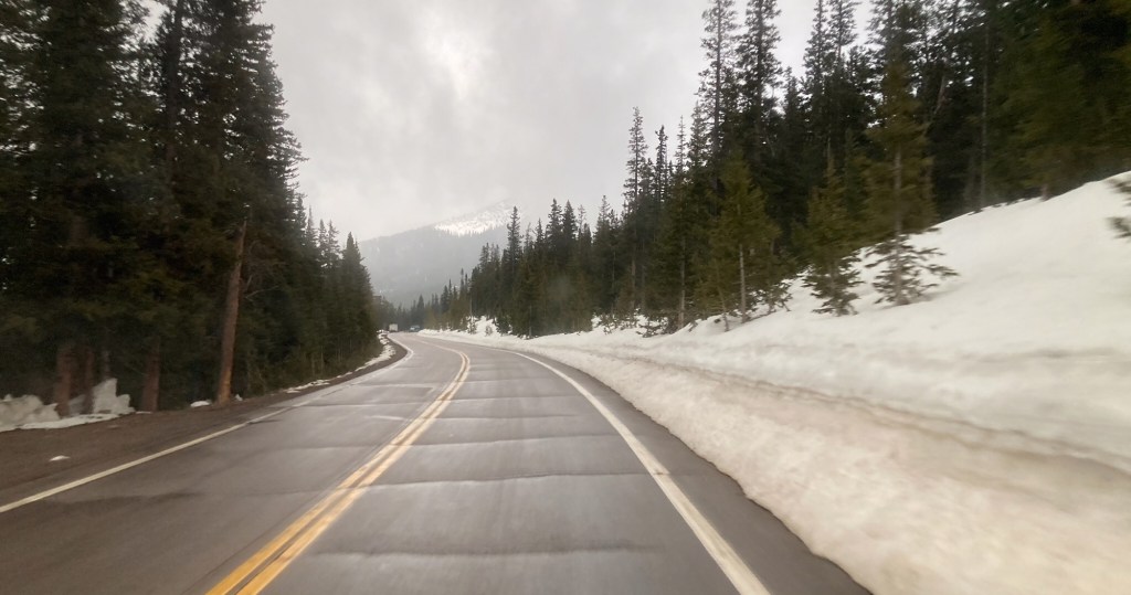 Nun aber weiter über den Trail Ridge Pass – und wieder Stopp! Die Durchfahrt ist noch gesperrt. Auf der Passhöhe liegt noch Schnee und die Straße wird erst am „Memorial Day“ (27.5.) geöffnet.