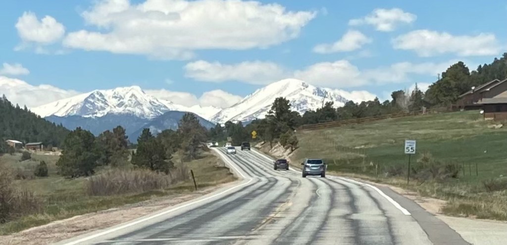 Der Pikes Peak HWY kostet 15$ „Eintritt“ pro Person und windet sich steil bergauf. Es wird immer kühler und bald liegt seitlich der Straße Schnee. 🥶 Hier oben kann man so manchem außergewöhnlichem Wesen begegnen. Warnungen gab es schon im unteren Teil der Strecke. Weiter Oben dann die Begegnung.