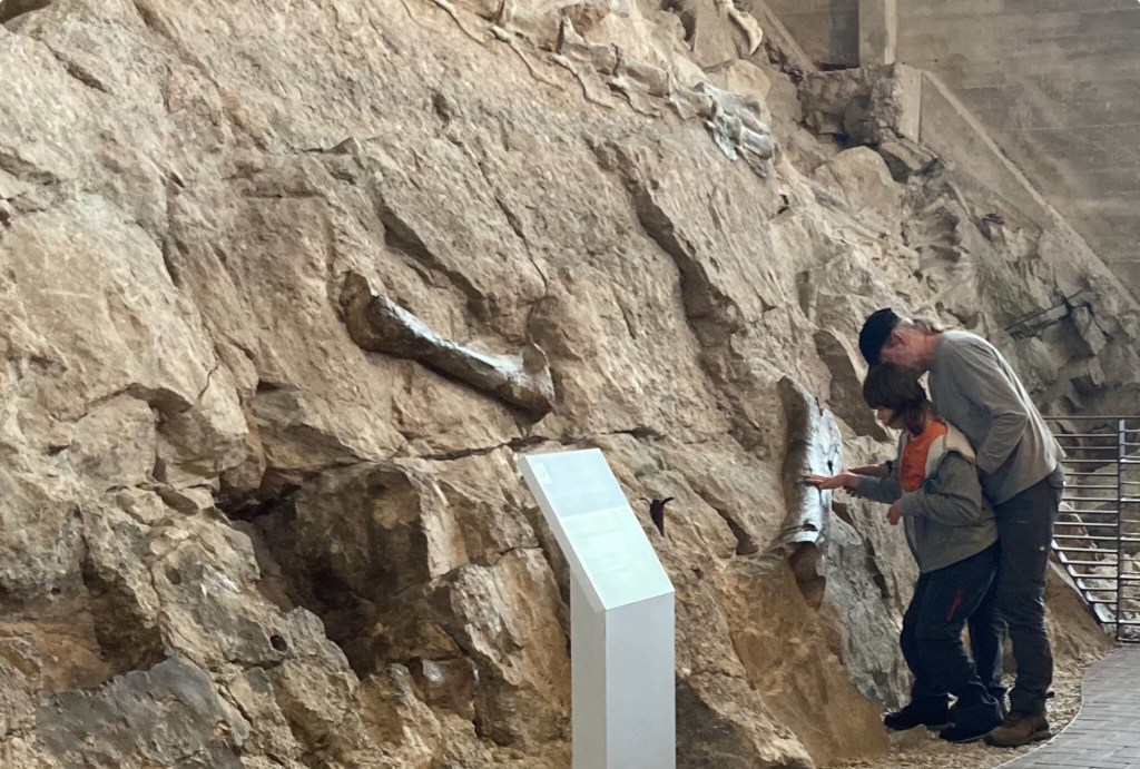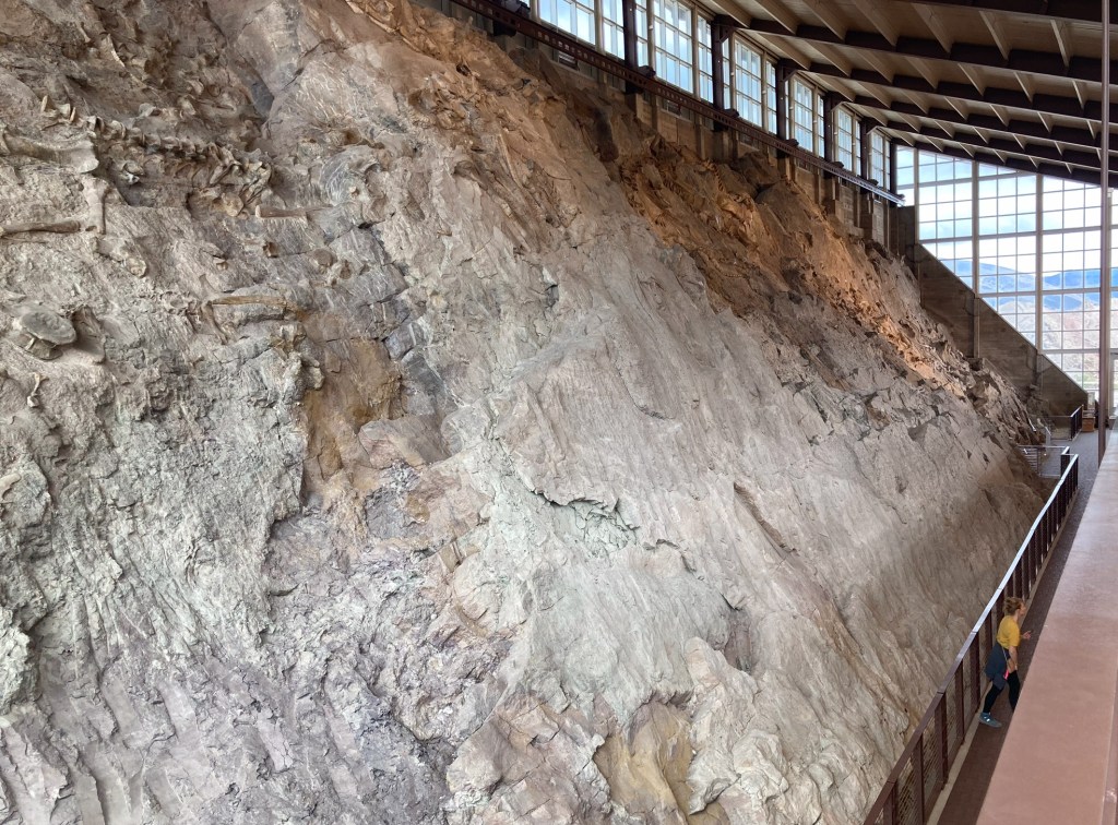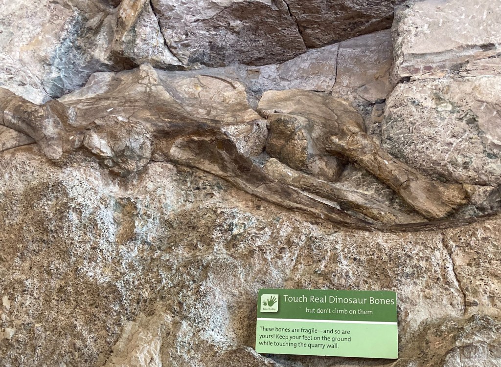 Die Gegend hier ist wohl eine der reichhaltigsten Fundstätten für Dino-Knochen. In einer Dürre vor ca. 150 Mio. Jahren starben hier wohl viele Dinos. Als das Wasser zurück kehrte wurden die Knochen im Sediment konserviert. Die Halle ist direkt an einer Fundstelle gebaut und veranschaulicht die originale Lage der Funde. Einige darf man auch anfassen, so konnte Lina auch ein wenig Jura erfühlen.