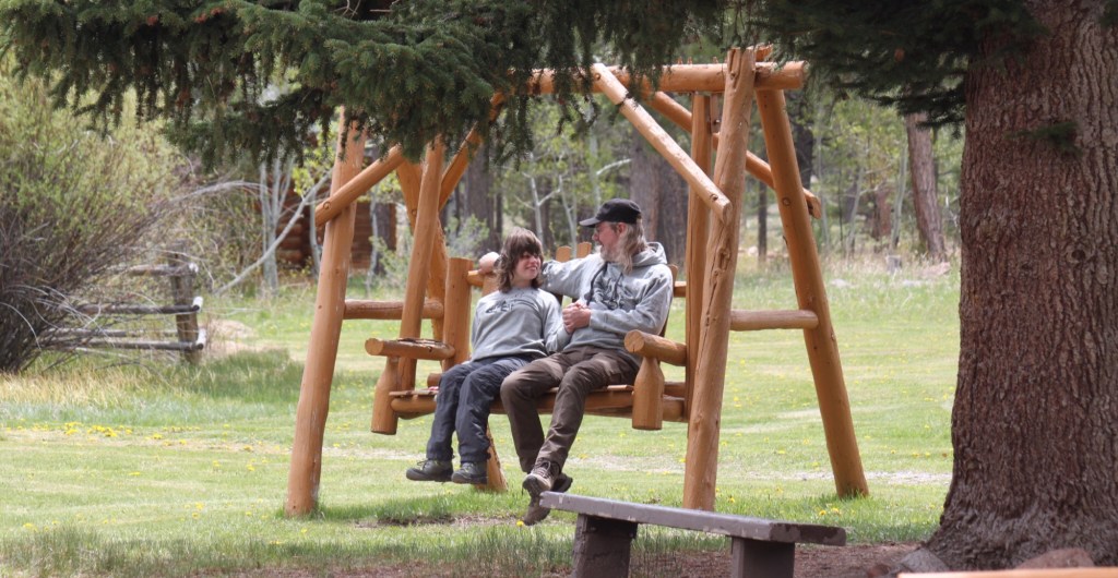 Nach so einer guten Stunde treffen wir uns dann an der Lodge wieder. Lina hat die Schaukel für sich entdeckt und Clemens muss mit schaukeln. Wie auf dem Foto zu erkennen ist, tut er das äußerst ungern. 😉