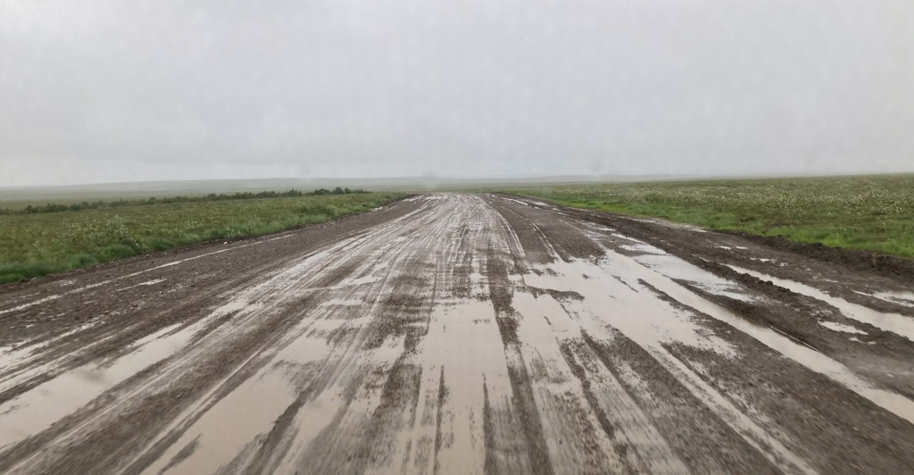 Die „Straße“ gleicht einer Schlammwüste und ist, man mag es kaum glauben, noch rutschiger als in trockenem Zustand. Gestern fühlte sich der Kies beim Fahren schon rutschig an, heute ist das unebene Schmierseife.