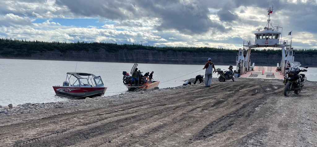 Diejenigen, die sich den Dempster mit dem Motorrad antun, haben es jetzt leichter. Das Motorboot bringt sie (einigermaßen) sicher rüber.