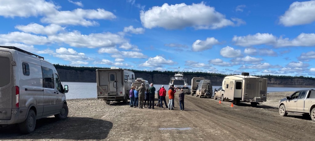 Dann erreichen wir 160 km hinter Inuvik die Fähre über den Mackenzie River. Anstellen in der Schlange dreckiger wartender Fahrzeuge.