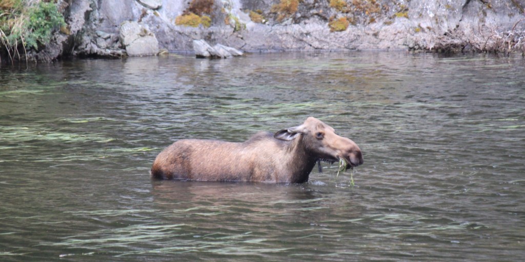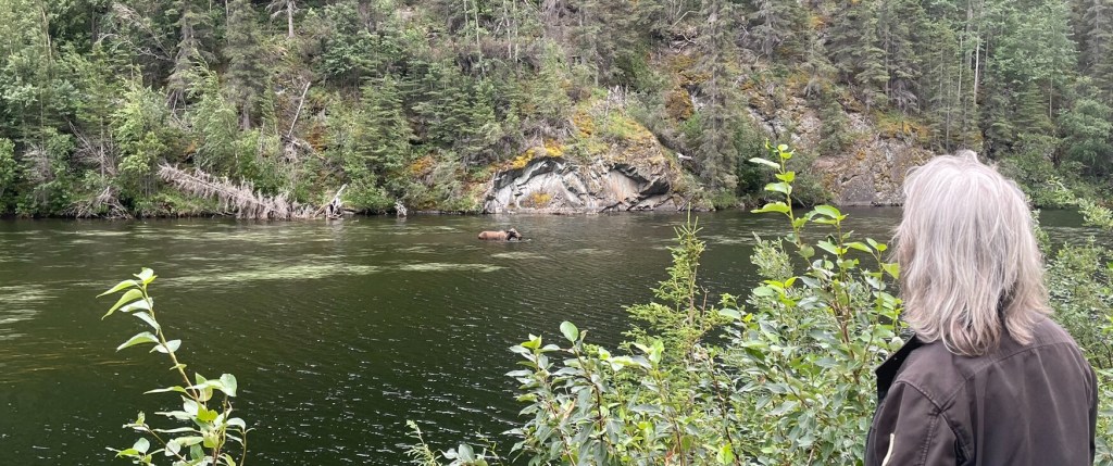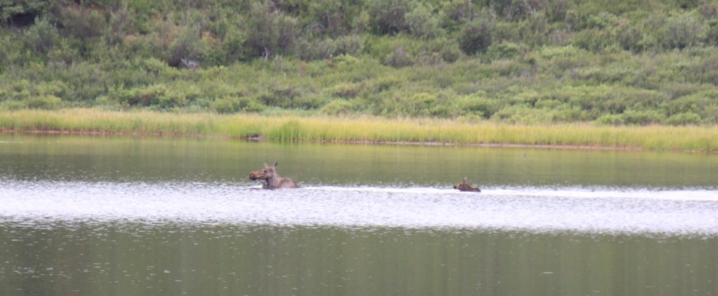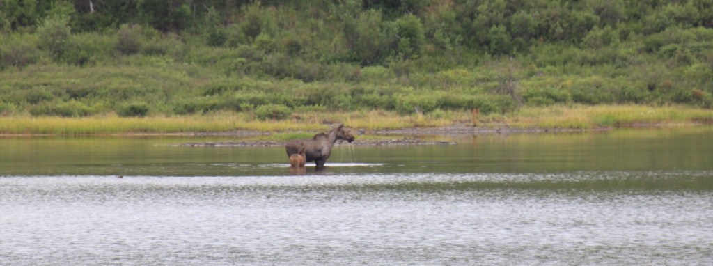 „Stopp doch mal“ Sabine hat gleich rechts neben dem Highway eine Elchkuh mit Kalb im Wasser entdeckt. Natürlich müssen wir davon Fotos machen. Die Tiere scheinen gute Schwimmer sein.