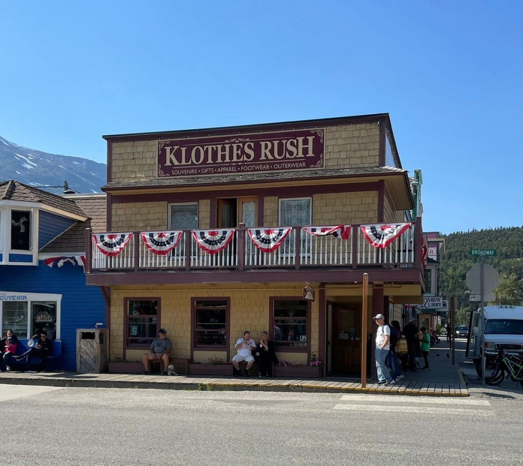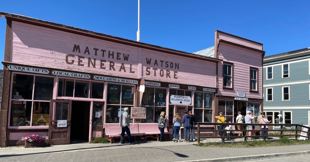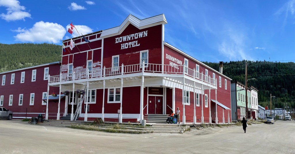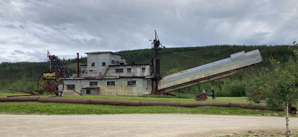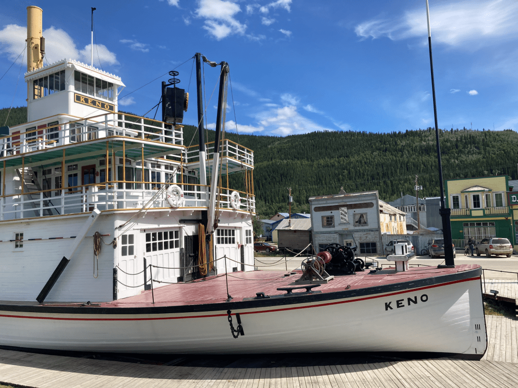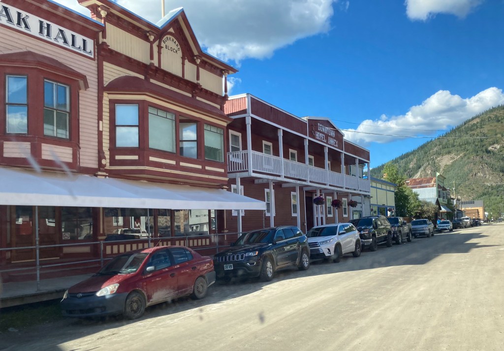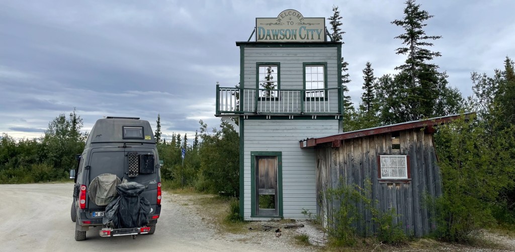 Nach wenigen Kilometern erreichen wir Dawson City. Für Clemens der Inbegriff einer Goldgräber Stadt. Hier wirkt so manches noch wie direkt aus dem Goldrausch 1899 in die heutige Zeit versetzt. Die Straßen sind unbefestigt, die Gehwege sind aus Holz und die Häuser haben schmucke Fassaden.