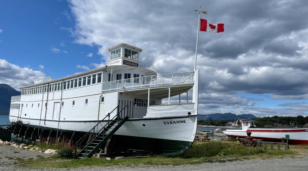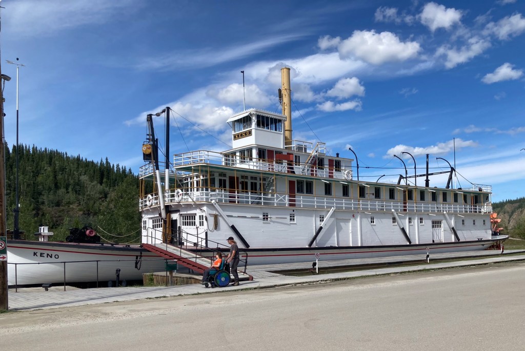 Ein alter Raddampfer (Engl. Sternwheeler) steht restauriert am Ufer des Yukon.