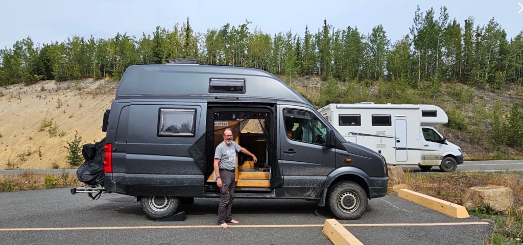 Geschafft! Wir sind wieder an Anfang (km 0) des Dempster angekommen. Was bleibt nun eigentlich? 1800 km Schotterpiste, mal besser mal schlecht, sehr wenig Siedlungen, viele weite Landschaften, das Gefühl, am nördlichen Ende der Reise angekommen zu sein, die Erkenntnis, dass eine ausgefallene Fähre mehrere Tage Wartezeit bedeuten kann und ein Rocky, der nach einer Wäsche ruft. 😂