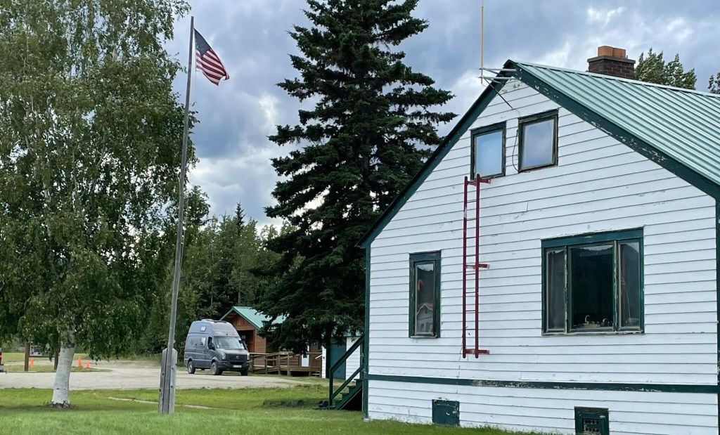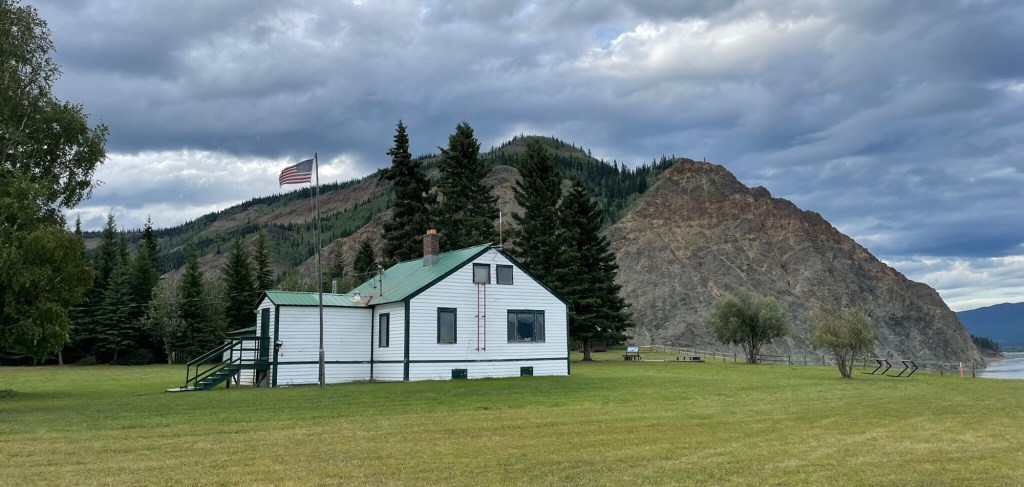 Eagle an sich besteht aus einer Ansammlung alter und älterer Gebäude. Der „Supermarkt“ besteht aus drei Regalen und einer Kühltruhe im Erdgeschoss des örtlichen B&B. Lustigerweise ist im gleichen Raum auch die Kneipe des Ortes. Die weiße Rangerstation ist schon ein Hingucker und wir treffen wieder nur nette Menschen. So dürfen wir auch das gefilterte Wasser der Ranger für unseren Tank nutzen und fahren mit vollem Wassertank wieder zurück.