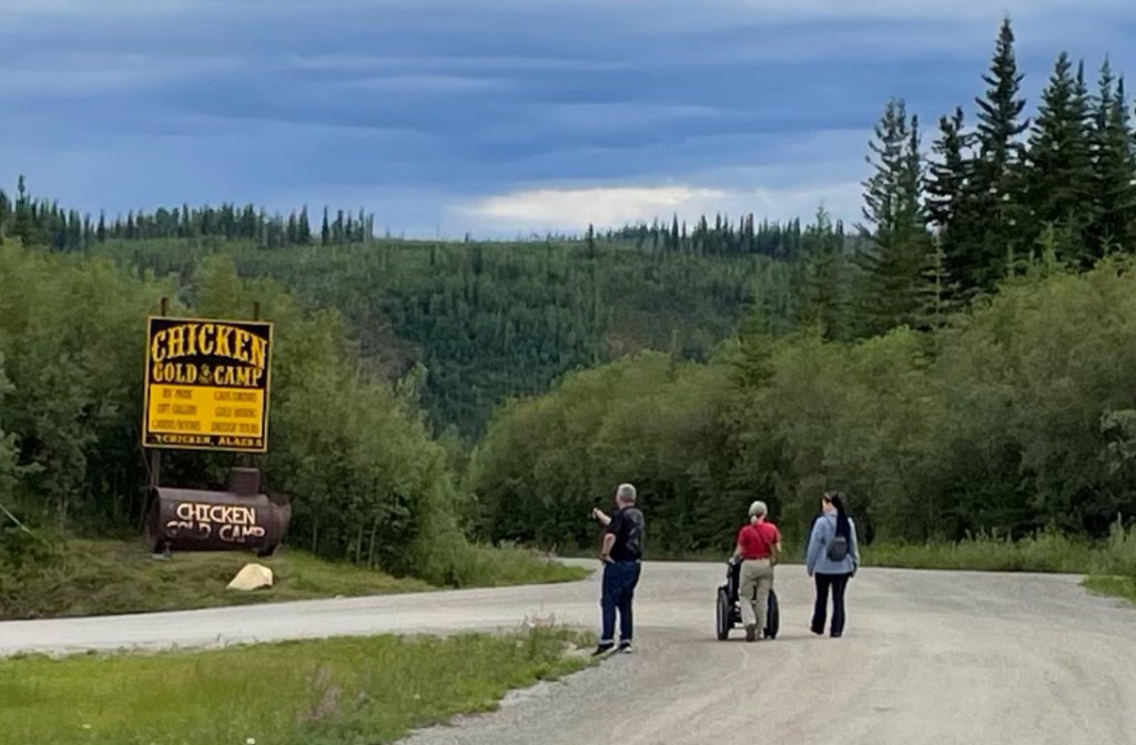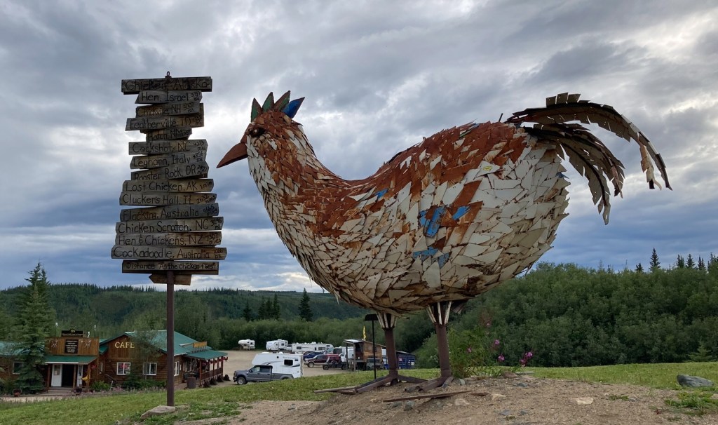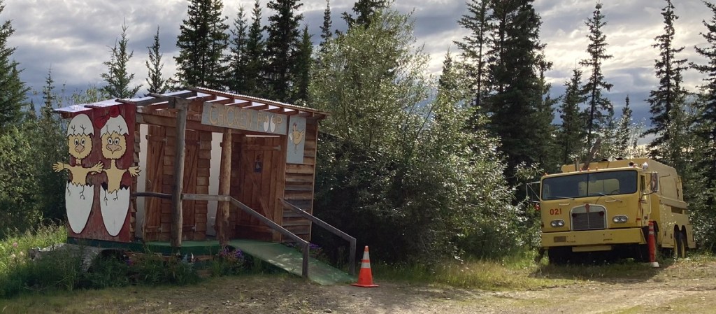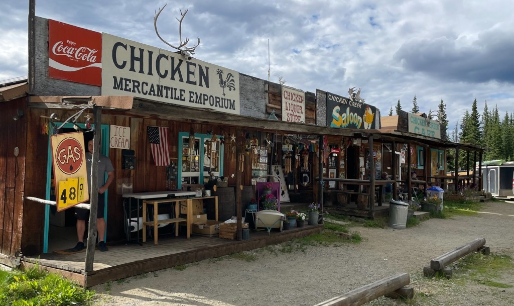 Auf dem Weg nach Chicken, der Ort sollte eigentlich Ptarmigan heißen, da es hier sehr viele dieser Vögel gibt. Das konnte nur kaum jemand schreiben und aussprechen, so heißt er nun einfach Chicken. Hier treffen wir Silvia und Ralf wieder und wir gucken uns gemeinsam um. Chicken Downtown besteht aus drei touristisch getrimmten Gebäuden. Eines ist natürlich ein Saloon. 😀
