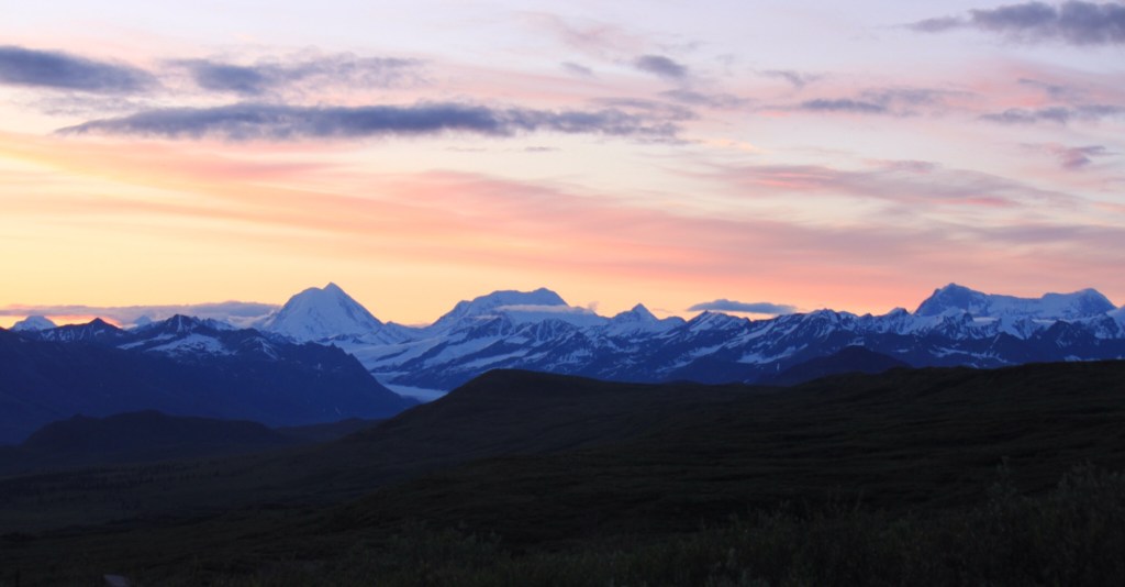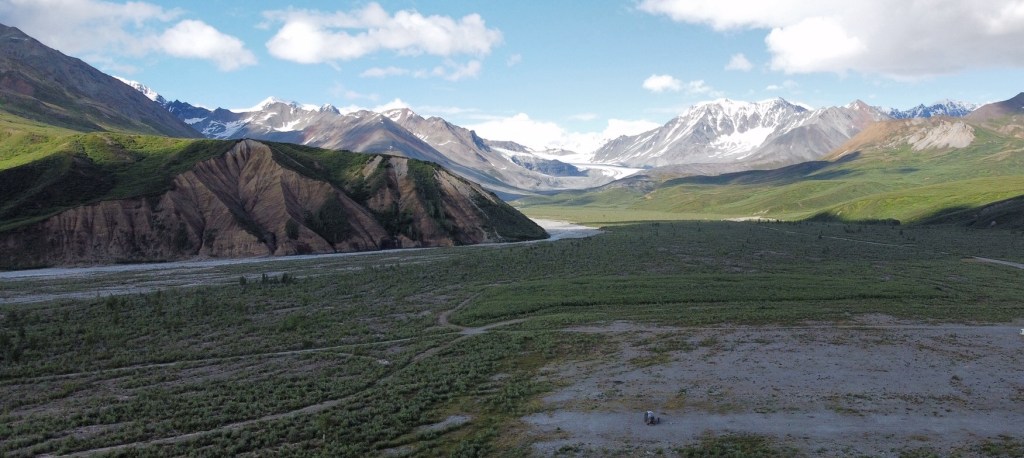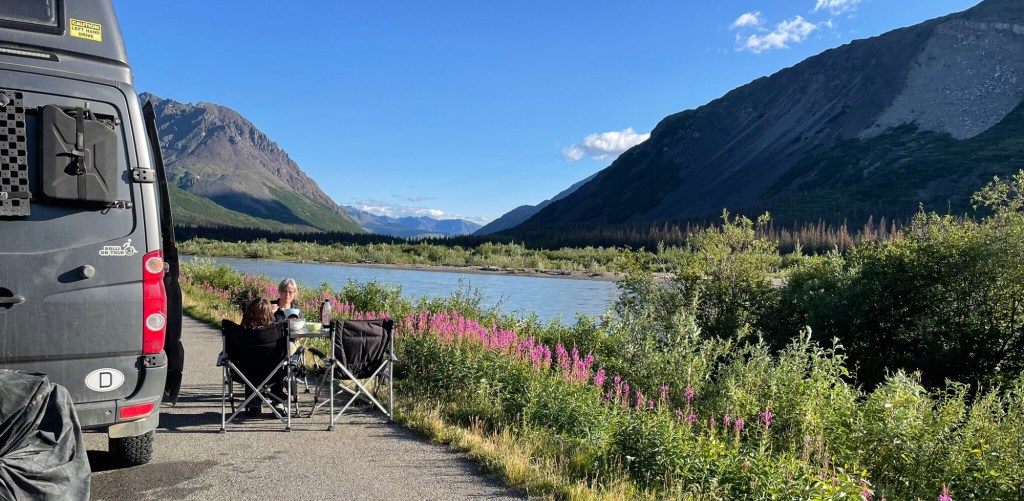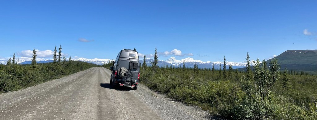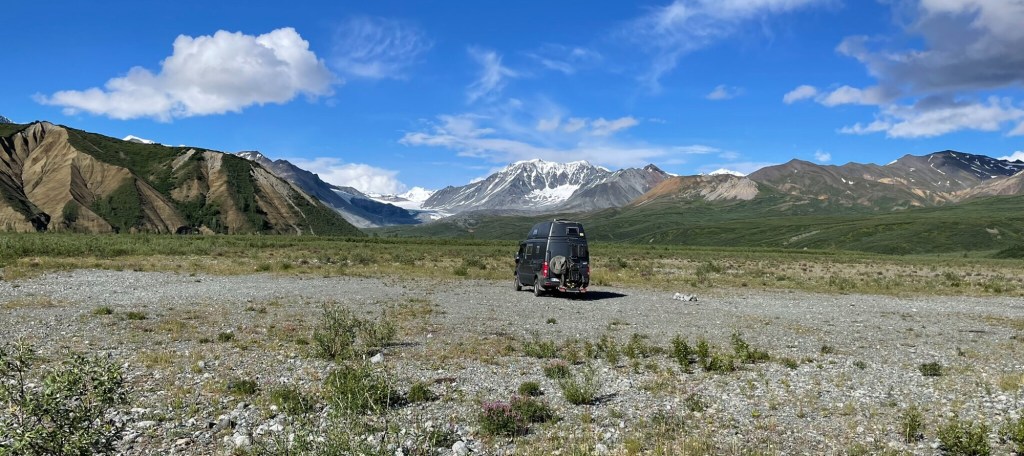 Guten Morgen, der erste Blick aus dem Fenster bestätigt mir, dass ich das Gestern nicht nur geträumt habe. Das da draußen ist Realität! Wieder einmal müssen wir uns klar machen, wie schön es ist, das erleben zu dürfen. Irgendwie ist es einfach unglaublich in dieser Umgebung einfach so übernachten zu können und am nächsten Morgen mit Blick auf ein unfassbares Bergpanorama zu frühstücken. So verbringen wir noch eine ganze Menge Zeit an diesen schönen Ort, trinken einen zweiten Kaffee im Freien, gehen spazieren und staunen die Alaska Range im Norden einfach nur an.