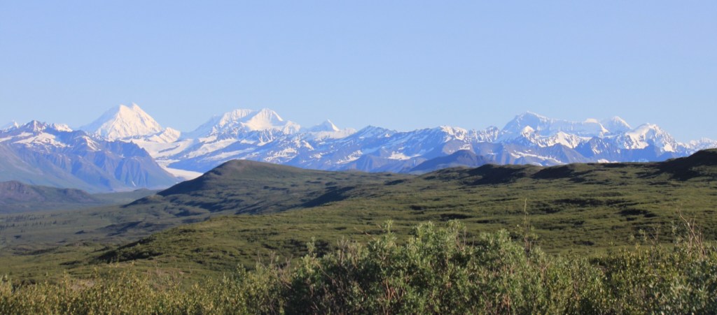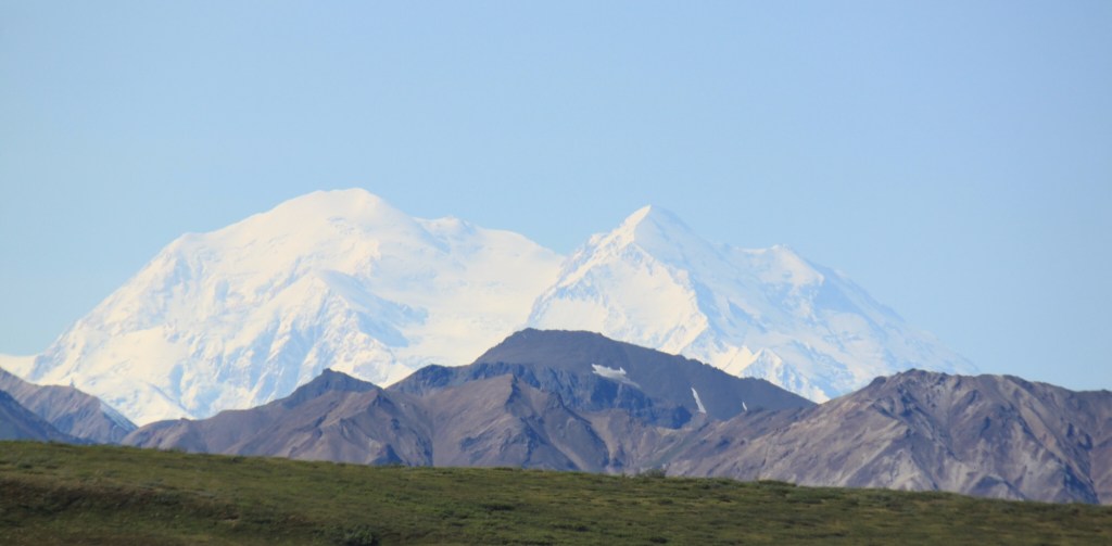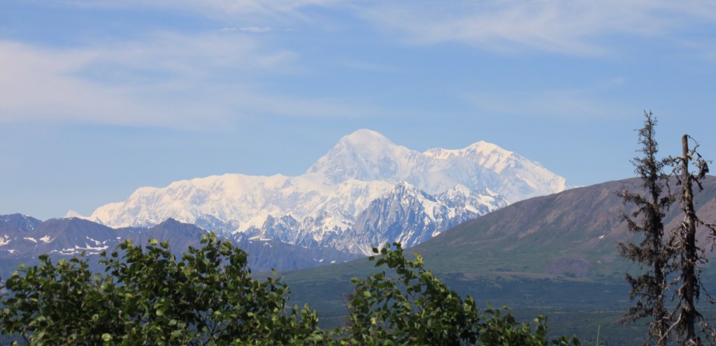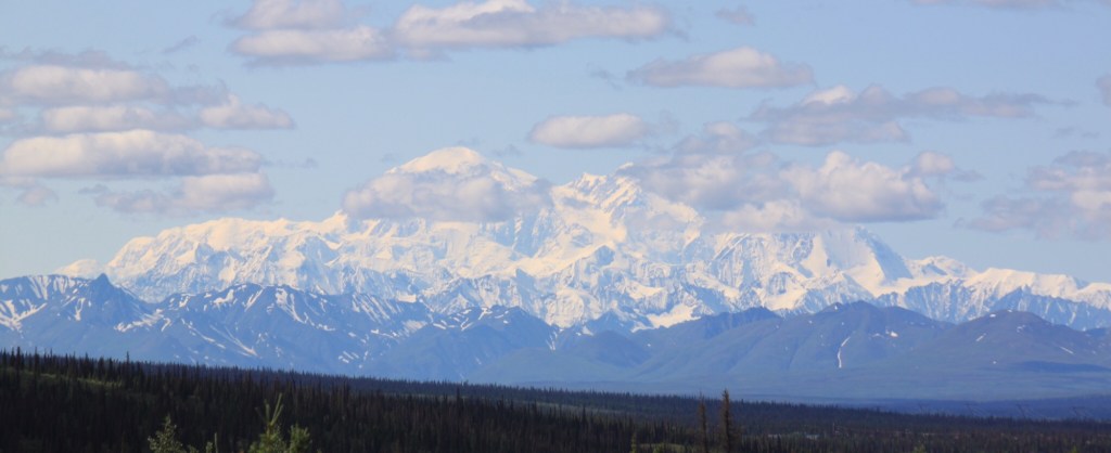 Der höchste Berg Nordamerikas, der Mt. Denali, zeigt sich fast ohne die sonst üblichen Wolken. Der erste Sechstausender, den wir in unserem Leben sehen. Irgendwie majestätisch wie der verschneite Riese dort vorne über allem thront.