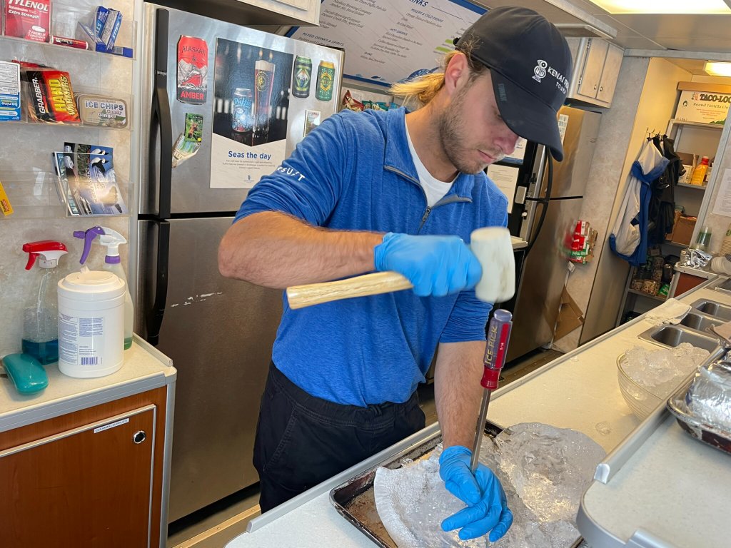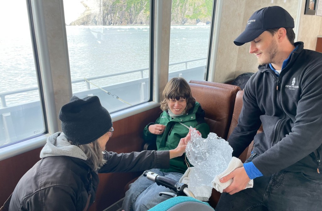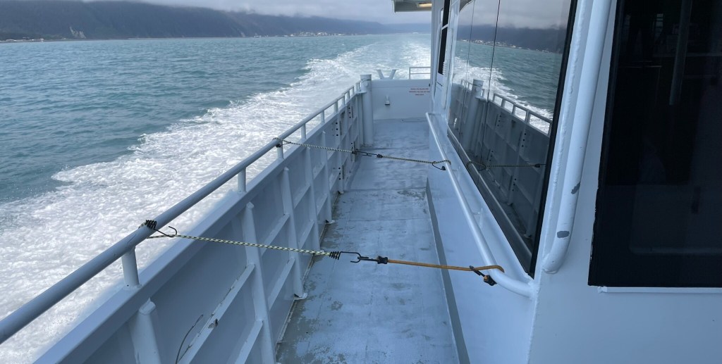Wir werden bei Kenai Fjords Tours äußerst freundlich empfangen und Lina darf als erste an Bord. Für sie wird auch gleich die Gangway vor dem Fenster an ihrem Tisch abgesperrt, damit sich niemand in ihr Sichtfeld stellen kann. Wir überlegen, ob wir in Deutschland auch soviel Service erlebt hätten??? Es ist aber auch viel Platz an Bord, so dass der Bereich auch nicht unbedingt gebraucht wird.