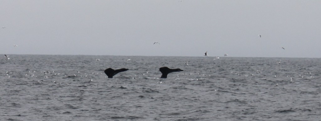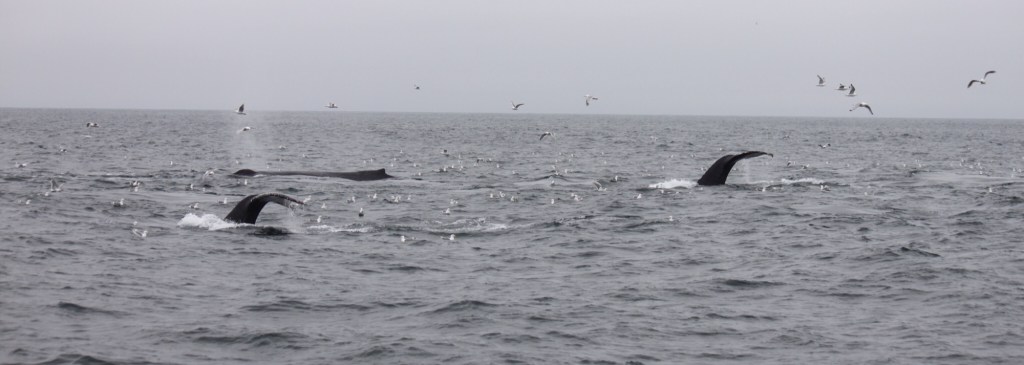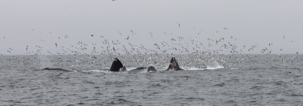Dann können wir Buckelwale bei der Jagd beobachten. So etwa 10 Tiere bilden einen Kreis aus Luftblasen, in dem die Fische „gefangen“ werden und tauchen dann selbst in diesem Kreis auf, um viele Fische im weit geöffneten Maul verschwinden zu lassen. Ein Schauspiel, dass uns eine Gänsehaut überkommt. So etwas haben wir zwar schon in Tierdoku‘s gesehen, aber life ist echt ne andere Nummer. 😍😍😍