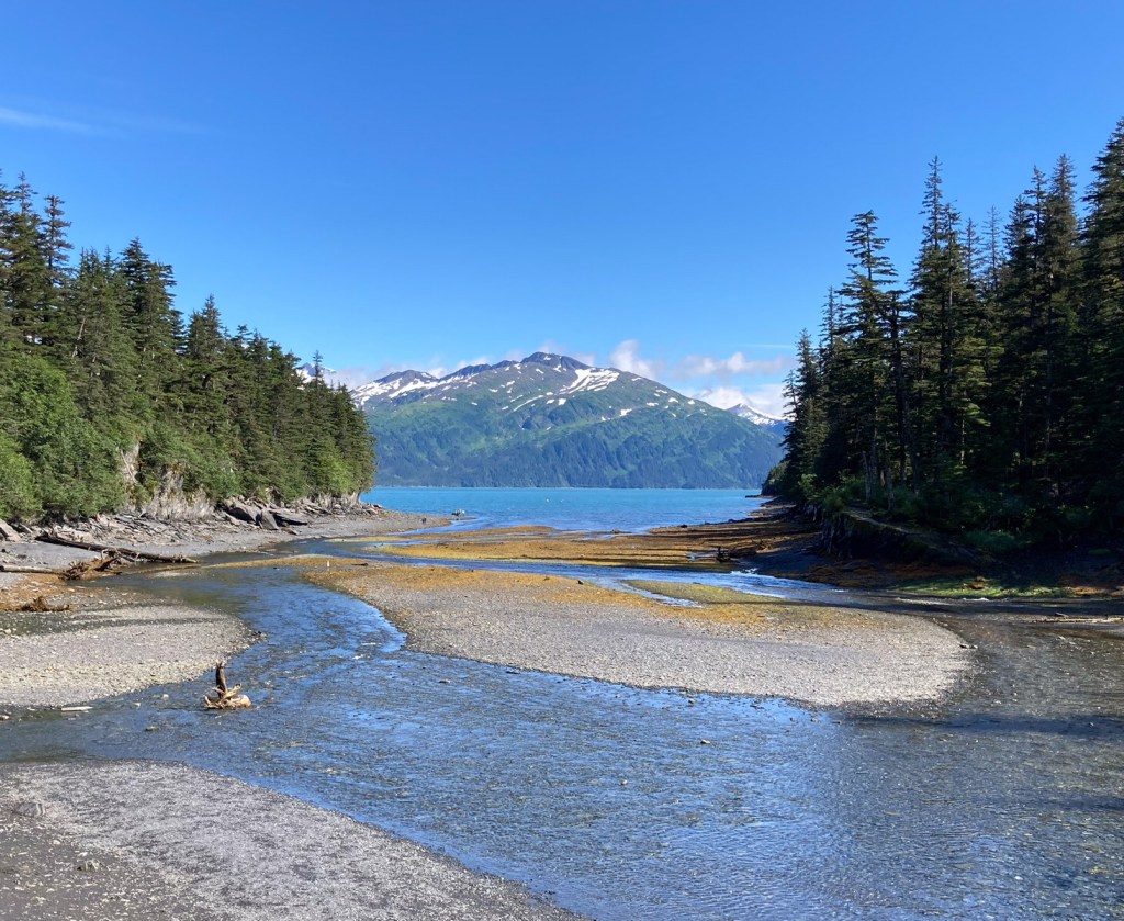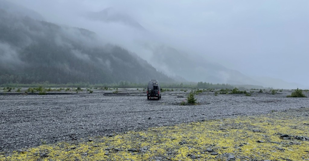 Uns zieht es weiter nach Seward auf der Kenai Halbinsel. Von dort aus werden Wal- und Gletschertouren in den „Kenai Fjords NP“ angeboten. Wir buchen bei „Kanai Fjords Tours“ die Gletscher Tour in den National Park, der nur mit dem Boot erreichbar ist. Heute finden wir mit Hilfe von iOverlander einen außergewöhnlichen Übernachtungsplatz im Flussbett des Resurrection Rivers. Sabines Frage: „Wozu haben wir denn 4WD?“, ist einfach zu beantworten: „Um die letzten 300m zu solchen Plätzen zu schaffen!“ Nun, es ist etwas schwierig rein zu kommen, aber einfach phantastisch zum übernachten.