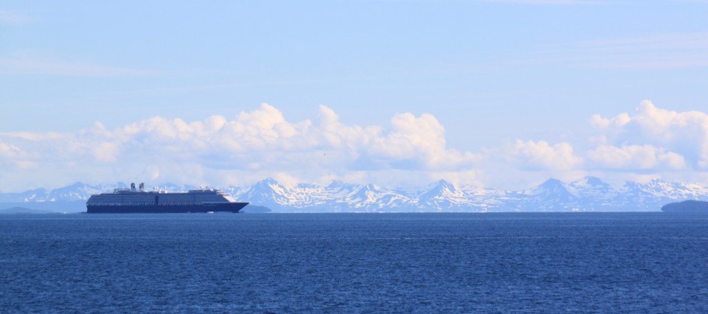 In der Ferne sind Kreuzfahrer vor den Bergen der Kenai Halbinsel