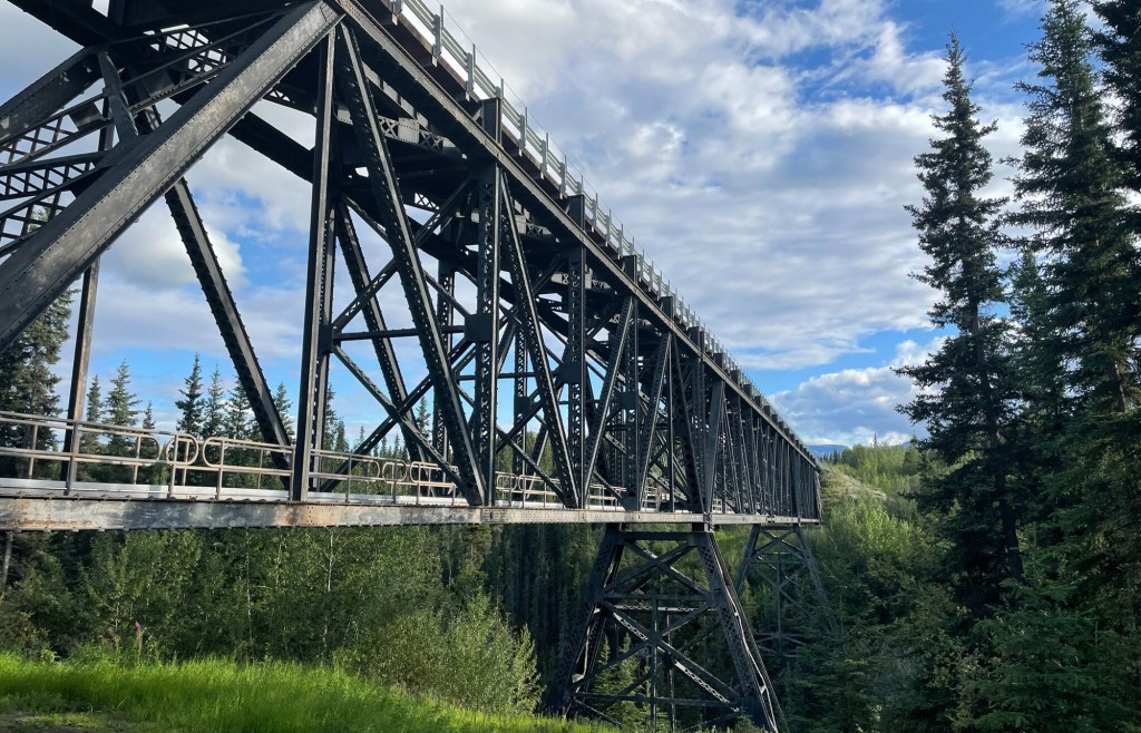 die 1910 erbaute Kuskulana Eisenbahnbrücke, die nun, einfach mit Holzbrettern belegt, als Straßenbrücke genutzt wird. Vor 10 Jahren bekam die Fahrbahn sogar Leitplanken. Ist aber auch so noch ein komisches Gefühl bei über 90 m Höhe.