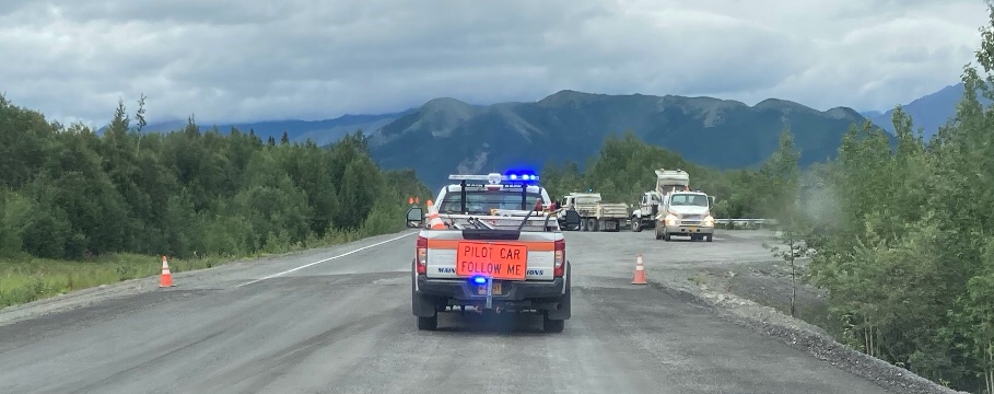 Der Tok Cutoff Hwy. von Glenallen nach Tok lässt sich durch die vielen Bodenwellen schlecht fahren. Zwischendurch zeugen Baustellen von den Bemühungen die Qualität zu verbessern. Anders als in Deutschland, ist es hier üblich, dass ein Pilot Car die an der Baustelle wartenden Autos hindurch führt. So brauchen sie keine provisorische Fahrbahn zu markieren und können den Durchgangsverkehr flexibel führen.