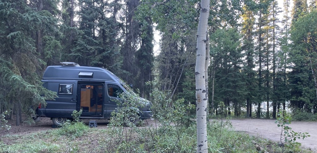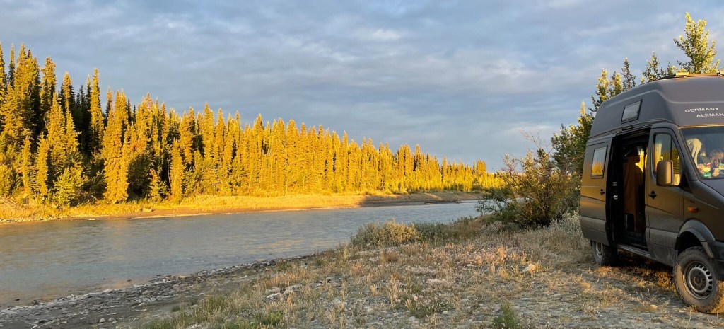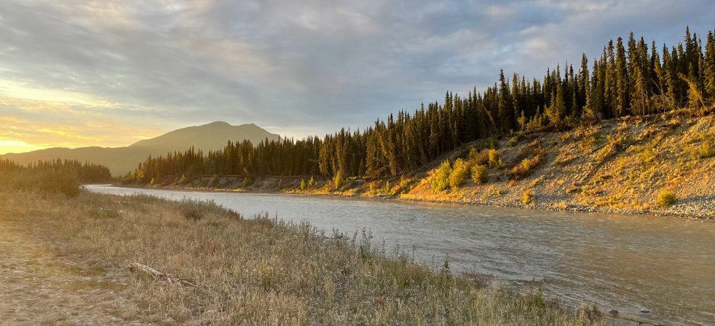 Kurz vor Burwash Landing finden wir ein Stück des alten Verlaufs vom Alaska Hwy. Dem folgen wir ein kleines Stück und entdecken etwas abseits einen Traumplatz am Fluss. Genug gefahren für heute, hier bleiben wir für die Nacht!