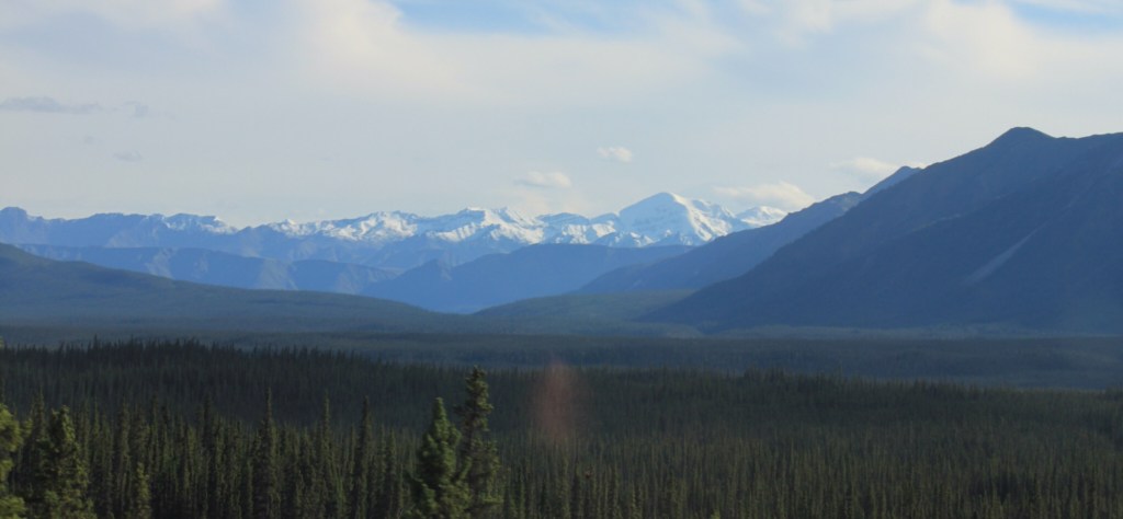 Im Anschluss der Busfahrt tanken wir noch Wasser im Park und fahren dann auf dem George Parks Hwy. weiter Richtung Anchorage. Ein Overlook erlaubt uns noch einen letzten Blick auf die Denali Gruppe.