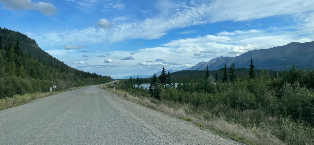 Noch ein kleines Stück auf dem Richardson Hwy., dann biegen wir in Paxson rechts auf den Denali Hwy. nach Westen ab. Auch hier rechnen wir mit Schotterpiste und Clemens reduziert an allen vier Reifen von Rocky den Luftdruck. Die Fahrbahn ist auf den ersten Kilometern zwar noch asphaltiert, wird aber immer schlechter. Die Landschaft und die Ausblicke werden dafür nach jeder Kurve besser!!!👍👍👍