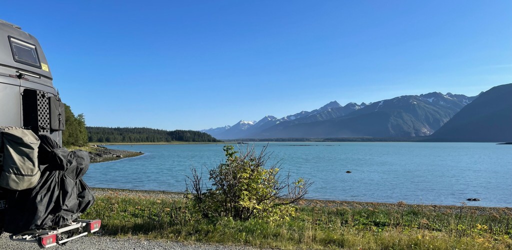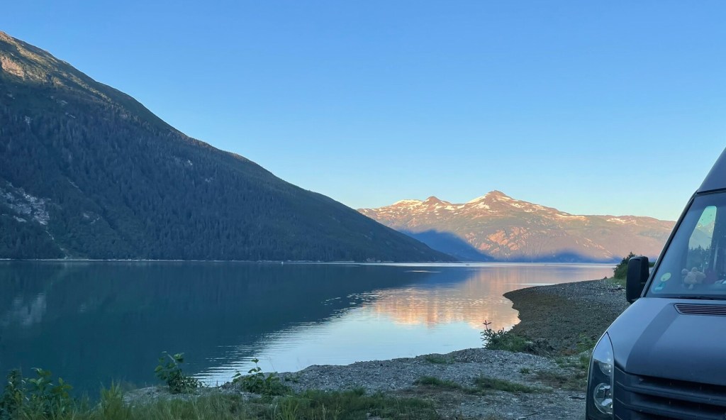Etwas überrascht sind wir dann, als wir feststellen, dass Haines auf US Amerikanischem Gebiet (also in Alaska) liegt und wir wieder über die Grenze müssen. Wie immer kein Problem und in 5 min sind wir durch. Der Beamte hat die üblichen Fragen gestellt, nur bei „Wie lange wollt ihr in den USA bleiben?“ mussten wir kurz überlegen. Ja wann reisen wir denn wieder aus? Wir haben noch kein Fährticket und online war die Fähre nach Skagway für die nächsten Tage ausgebucht. Also lautet unsere Antwort: „ein paar Tage, wenn wir keine Fähre buchen können sind wir übermorgen wieder hier“. So können wir weiterfahren und finden ganz in der Nähe von Haines einen Stellplatz direkt am Wasser, schöner Abschluss eines aufregenden Tages.
