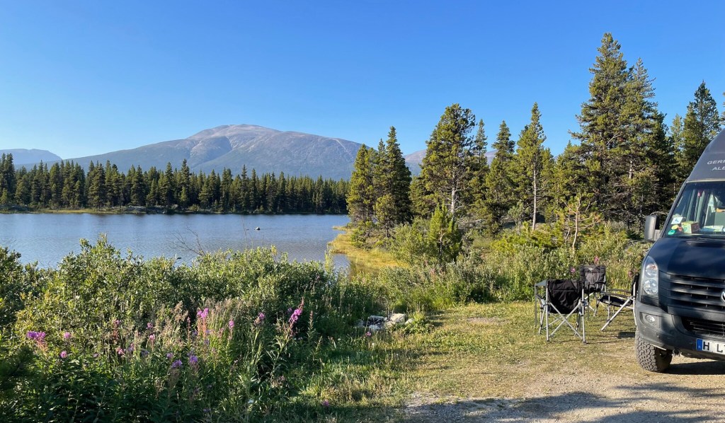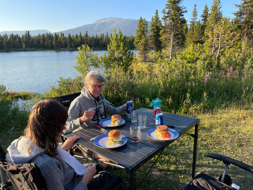 Etwas genervt von den vielen Leuten (wir sind es nach so langer Zeit in der Einsamkeit wahrscheinlich nicht mehr gewöhnt) treten wir die Flucht nach vorn an. Im RV-Park in der Stadt können wir unseren Wasservorrat auffüllen und fahren dann über den, bei den Goldsuchern damals so gefürchteten, „White Pass“ wieder zurück nach Canada. Ein Stück weiter finden wir einen einsamen See und genießen den Abend und die lecker Hamburger ganz für uns allein.