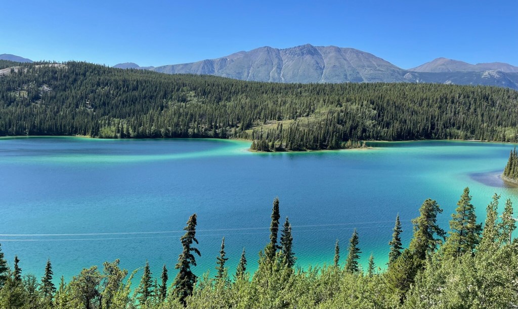 und rechts liegen die schneebedecken Gipfel des Kluane Nationalparks.